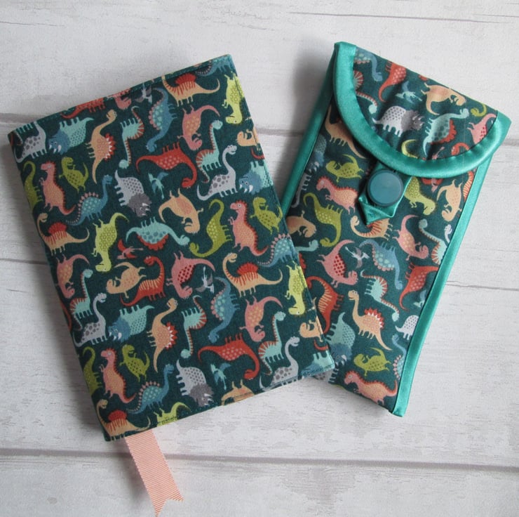A fun gift bundle for a budding paleontologist or fossil hunter comprising an A6 reusable notebook cover and glasses/phone case in cotton print of little dinosaurs on dark teal.