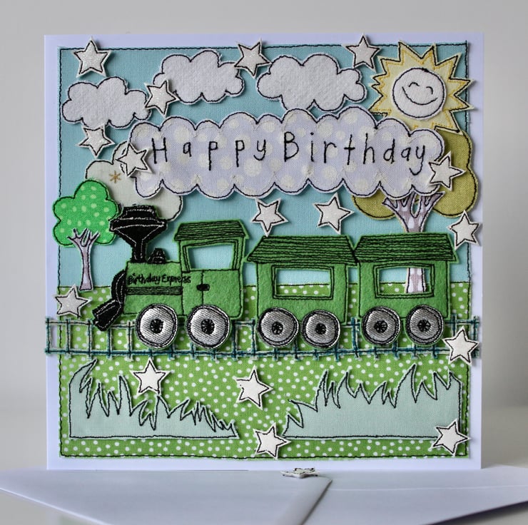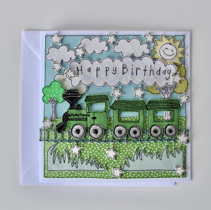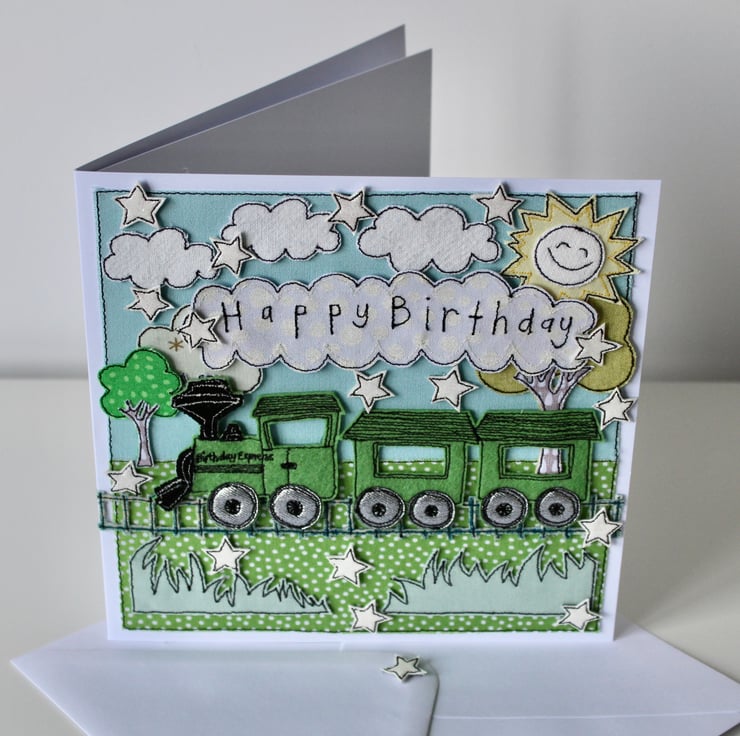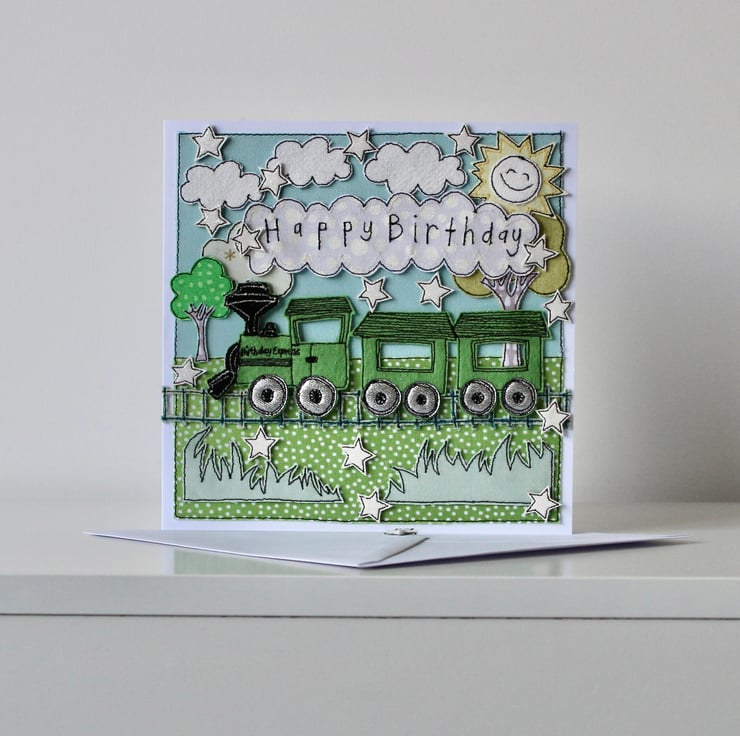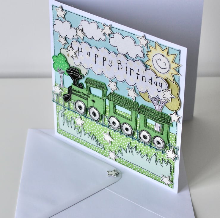 A birthday card which includes a train, a happy sunshine, fluffy clouds, trees and stars.