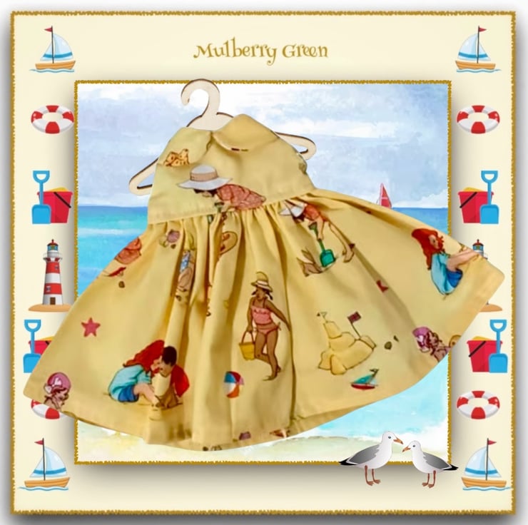 A lovely little dress in a Belle and Boo designer print - At the Seaside - to fit the Mulberry Green characters. The dress is made from best quality designer cotton, has a Peter Pan collar a lined bodice and two little hearts at the waistband.