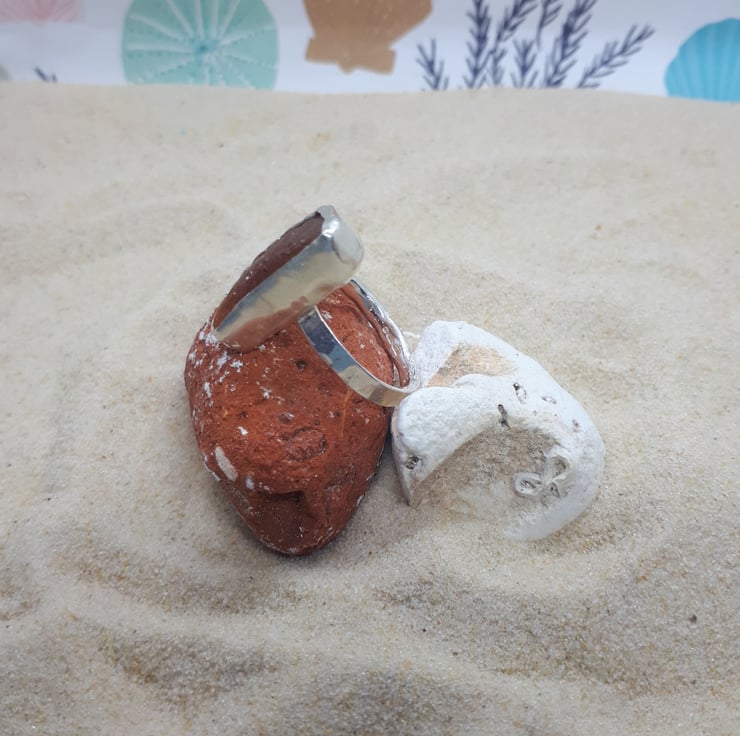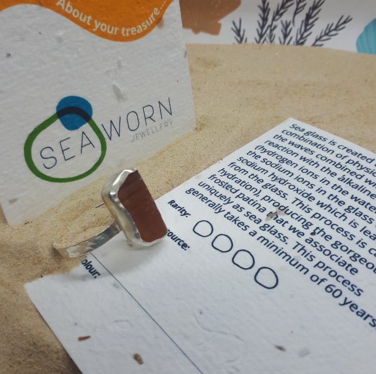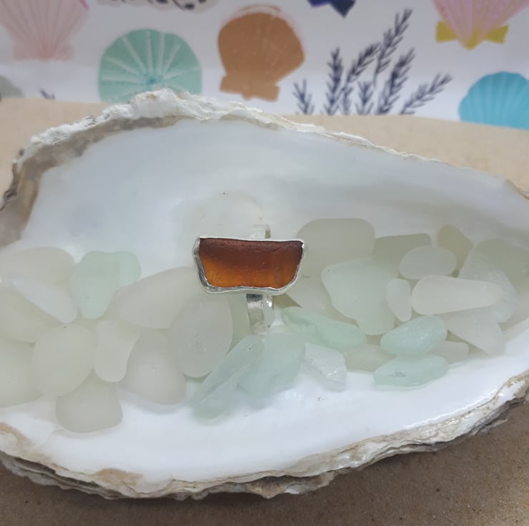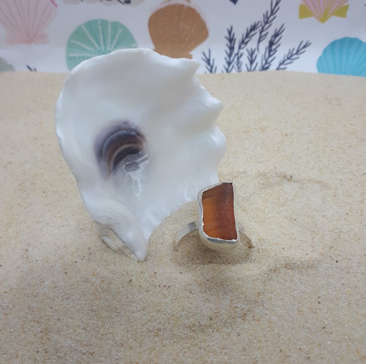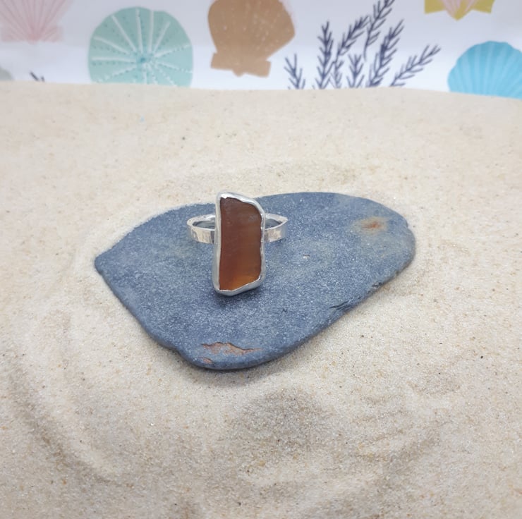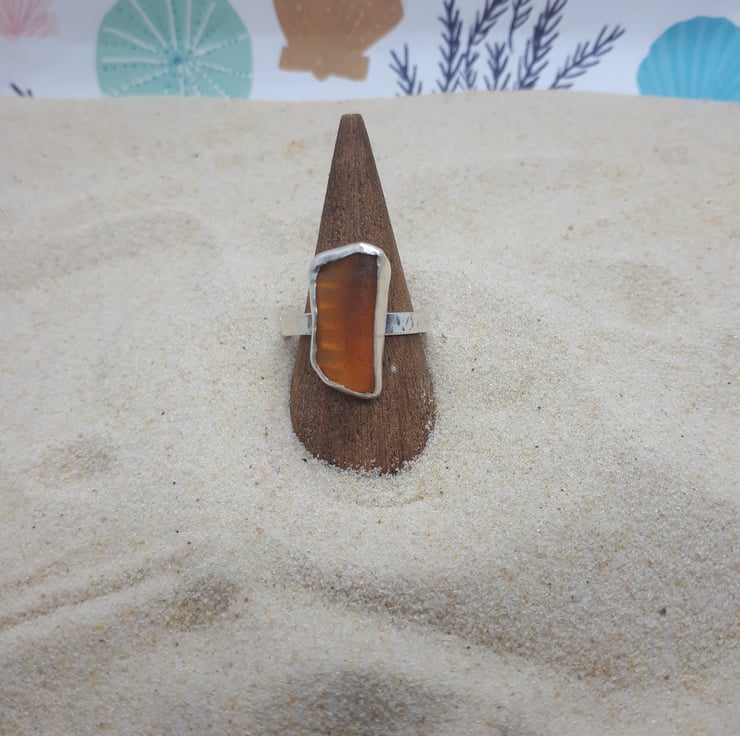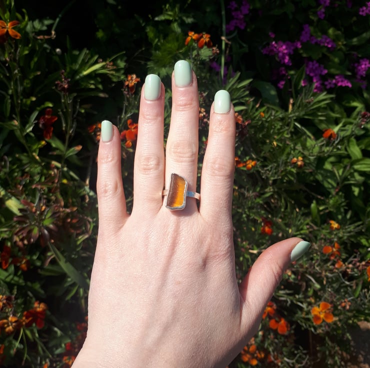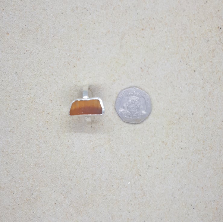 A piece of genuine UK sea glass (Orange) set in fine silver on a sterling silver hammered band.