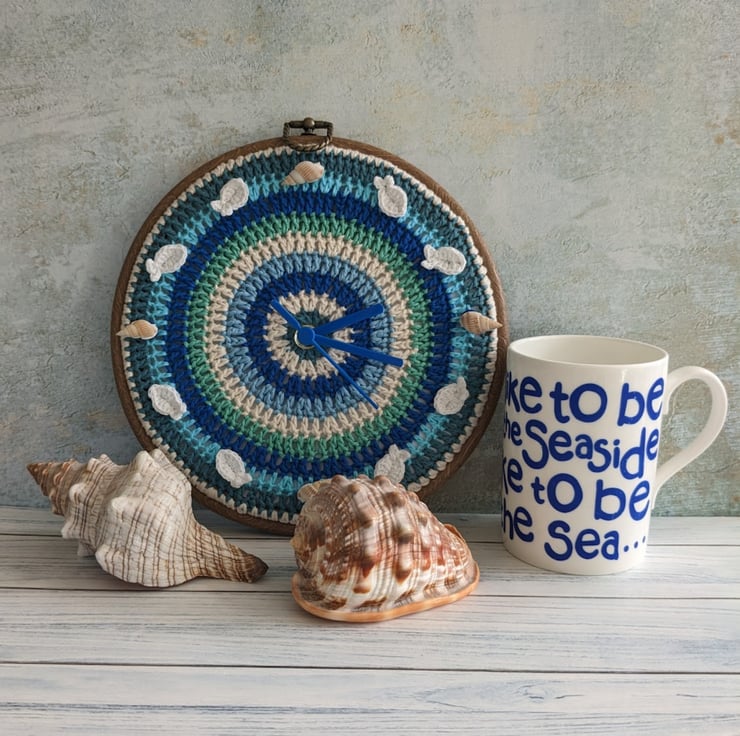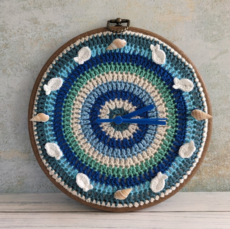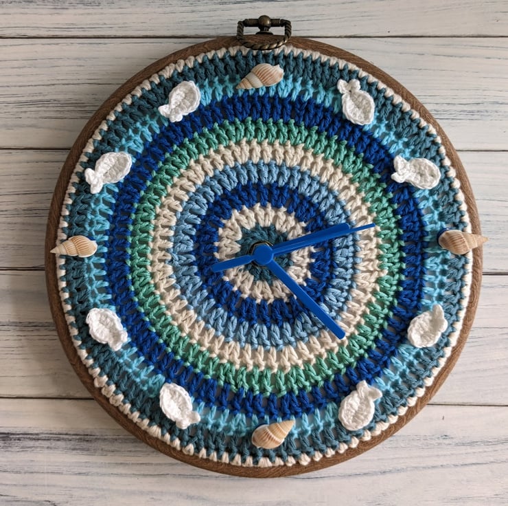 This quirky clock has a crocheted clock face made from cotton yarn in shades of blue, cream and green. Playful little white fish swim round the edge between real spiral shells, in place of numerals. I loved making this little clock which would be ideal for any seaside themed room and perfect decoration for a beach hut!
