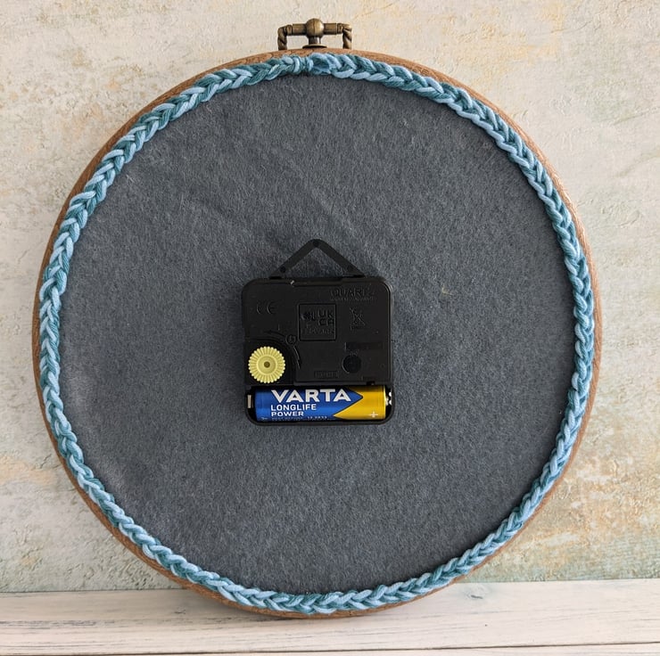 The clock face is fitted into an 8 inch / 20cm round wood effect embroidery hoop and backed with felt that is attached to the back of the clock and edged with a chain stitch ribbon.