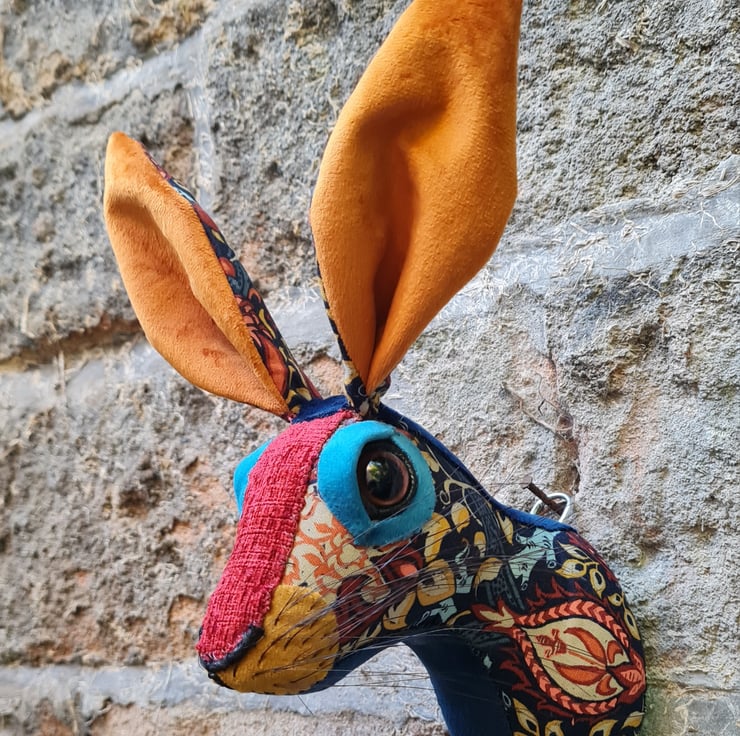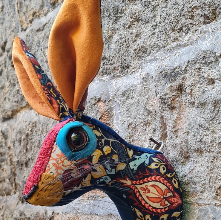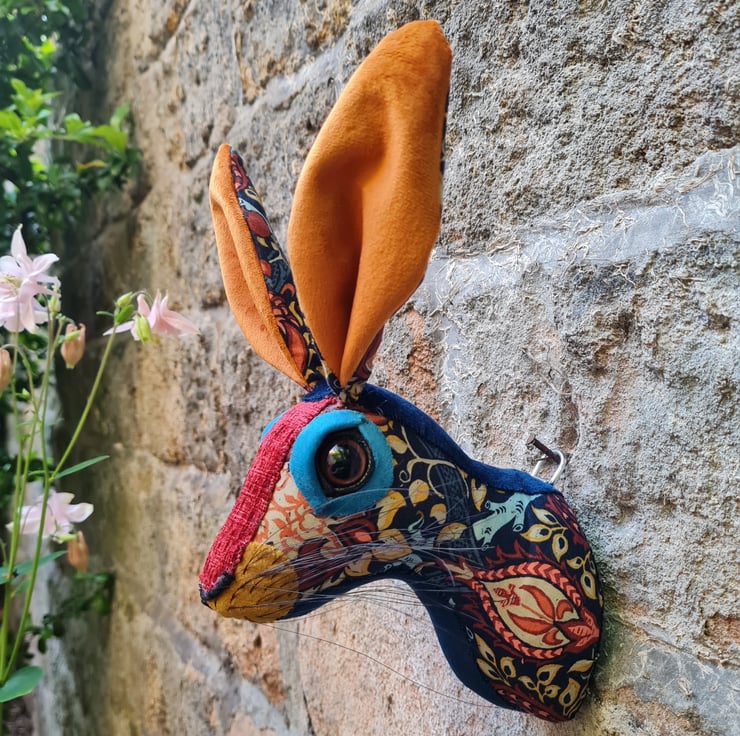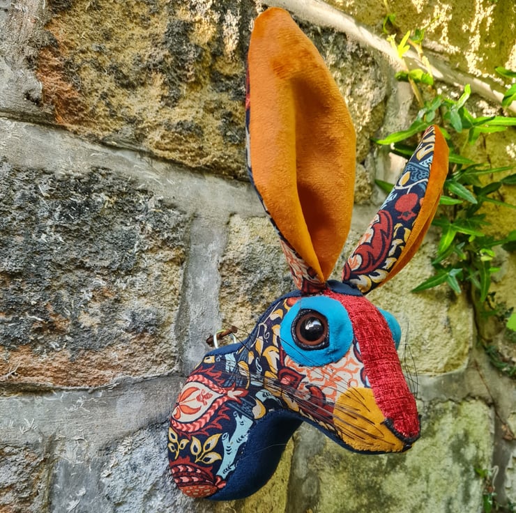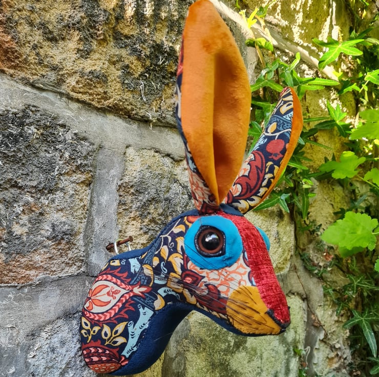 A lifesize faux hare which I have handmade and covered in hand stitched turquoise , teal and orange William Morris Granada fabric. The head is backed with felt and has a metal hanger to hang it on the wall. It is lightweight.