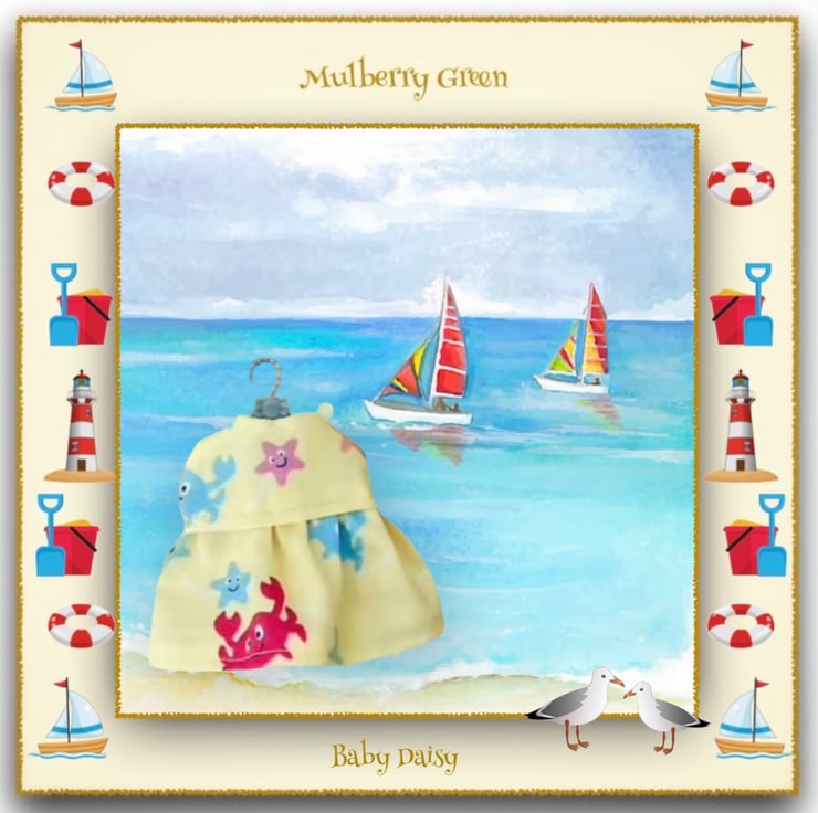 A pretty crab print dress to fit baby Daisy. The dress is handmade from best quality cotton, has a lined bodice and fastens at the back with a little popper