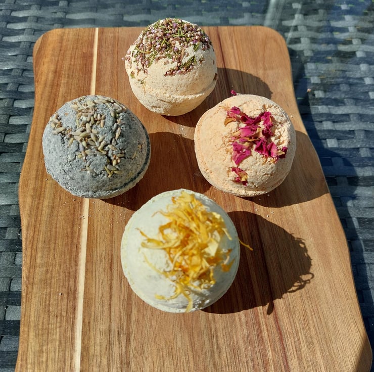 Indulge in Wildstock botanical bath bomb range. Each bomb is hand crafted on our smallholding in Carmarthenshire, West Wales, so you will see natural variation in colour, size and shape.