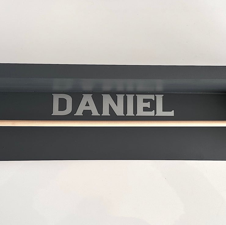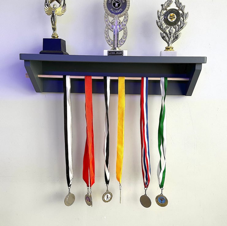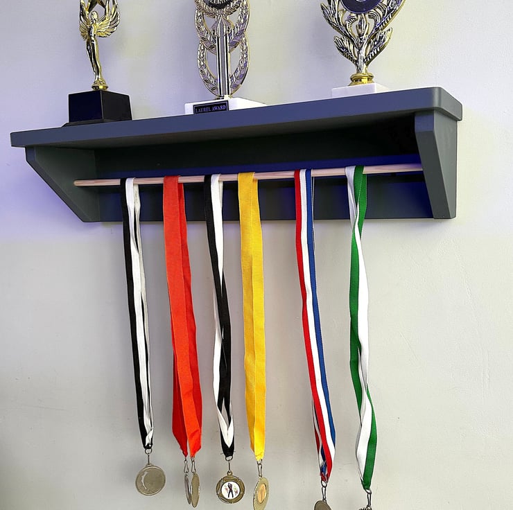 A trophy shelf and medal holder all in one. It can be personalised behind the rail too.