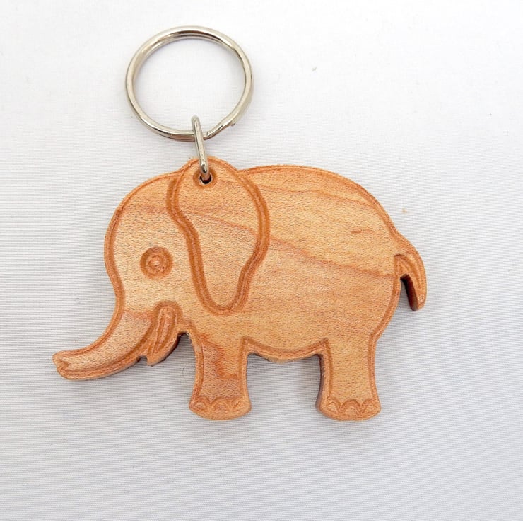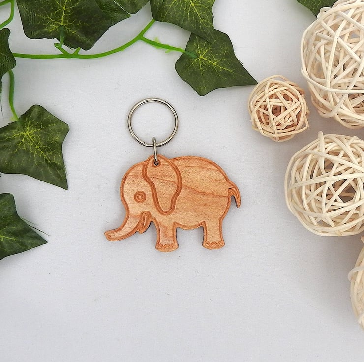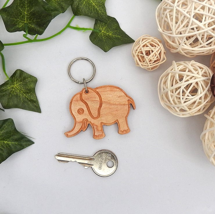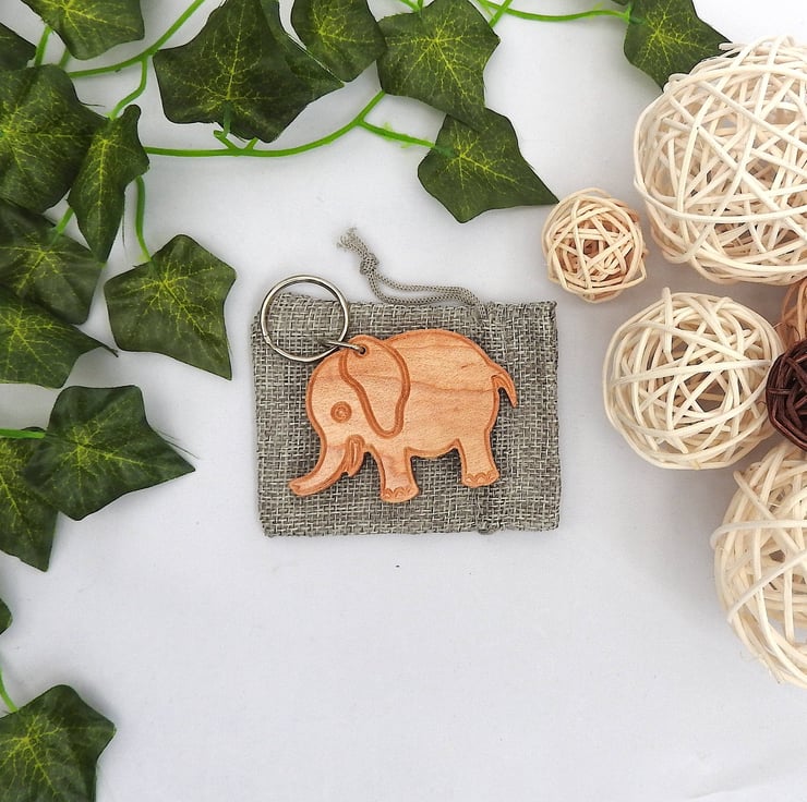A cute wood elephant keyring with a grey hessian gift bag.