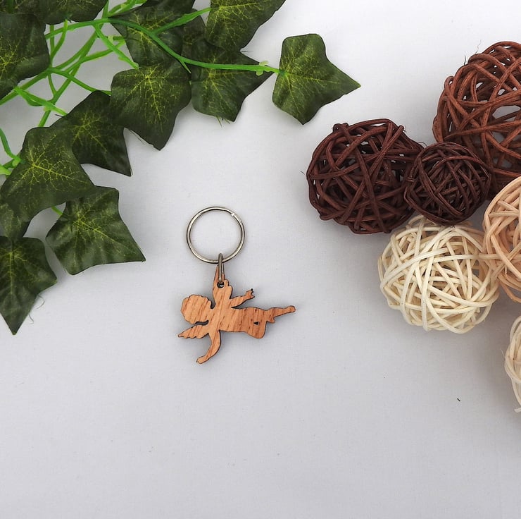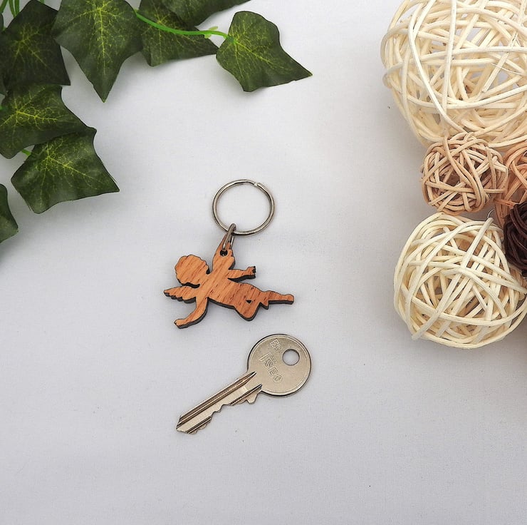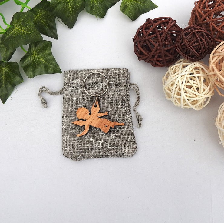 A wood angel keyring. A lovely way to remember a lost loved one or to have a guardian angel watching over. A simple but beautiful keepsake gift. Or use as a thank you gift for a friend.