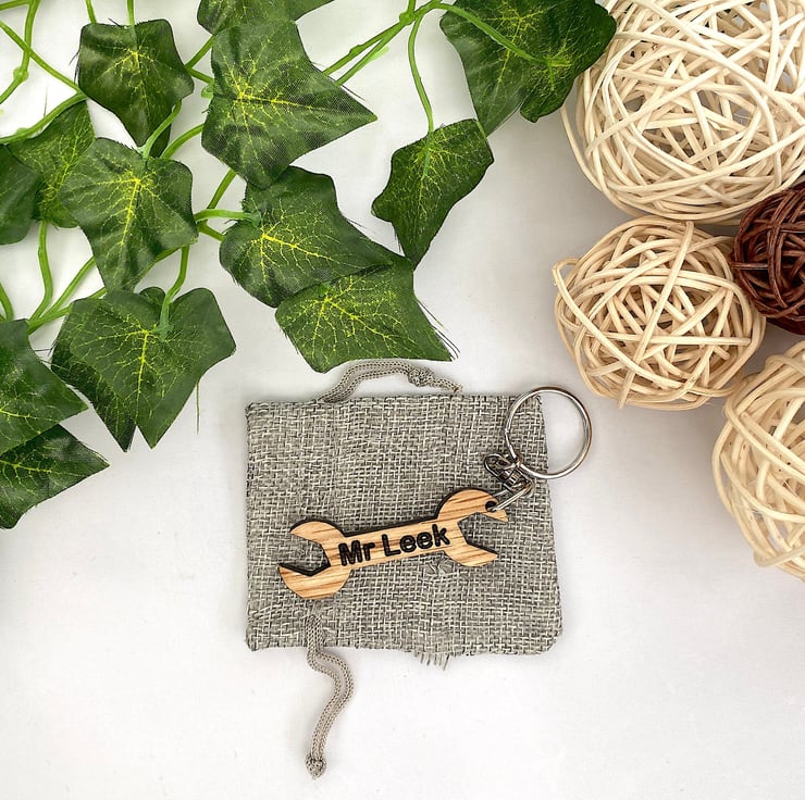 A personalised spanner keyring made from solid hardwood and is supplied with a grey hessian gift bag.
