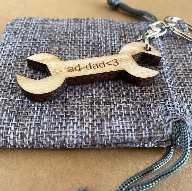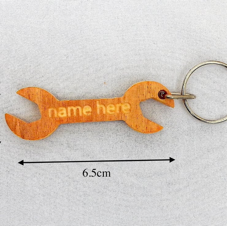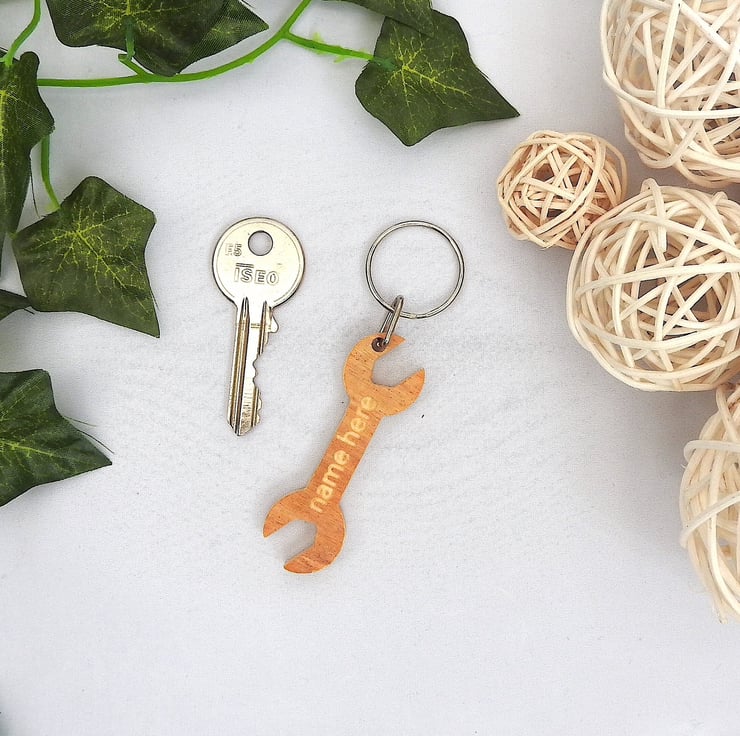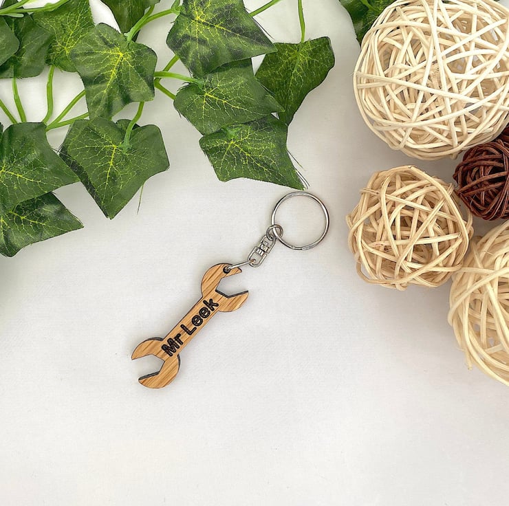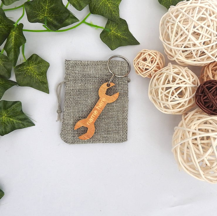 Personalised Spanner Keyring, Wood Tool Keychain with Gift Bag