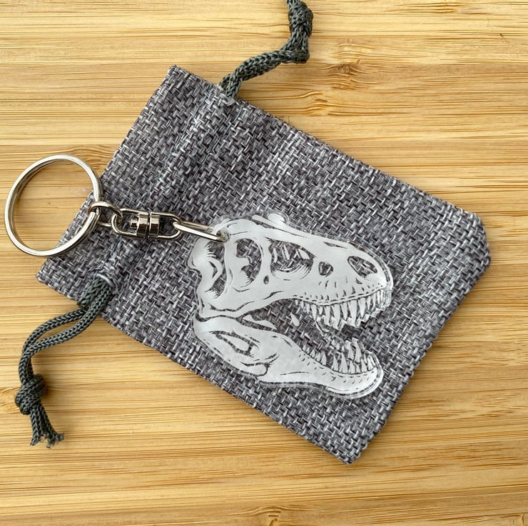A Tyrannosaurus Rex fossil keychain with a grey gift bag. A unique gift for someone who loves dinosaurs and makes a great stocking filler at Christmas.
