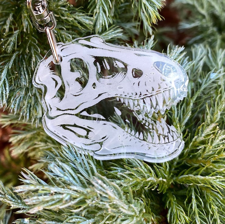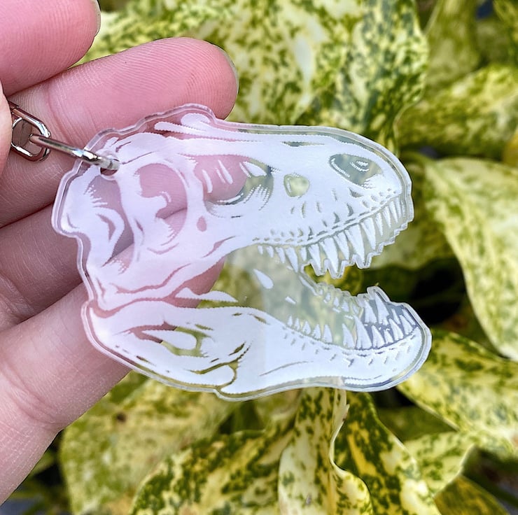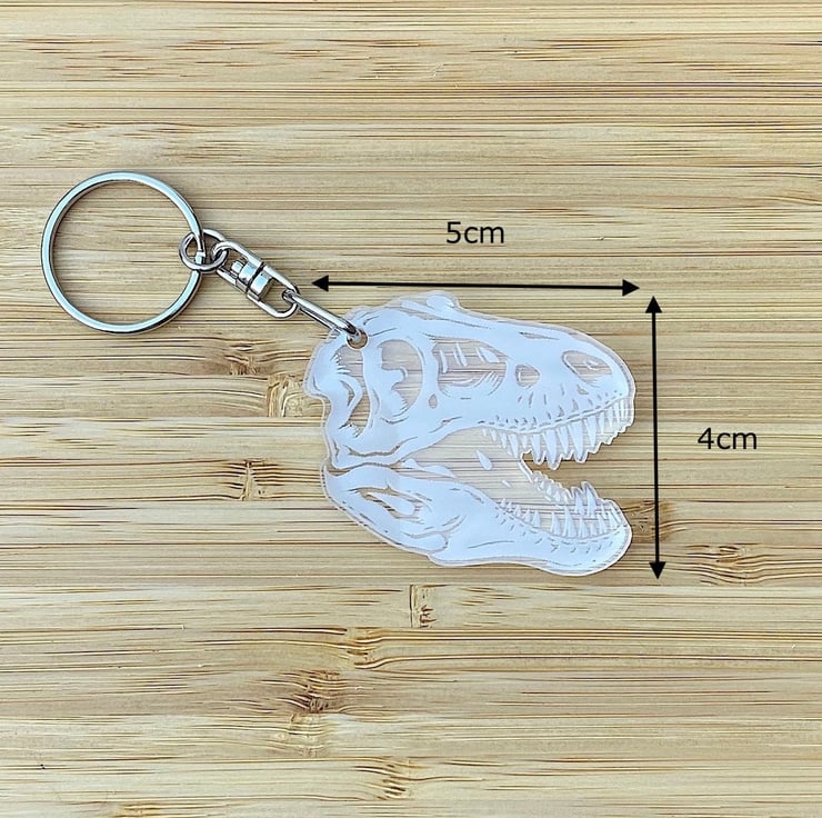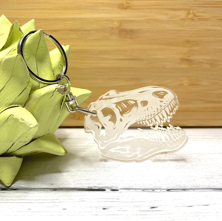 An acrylic dinosaur fossil keyring.