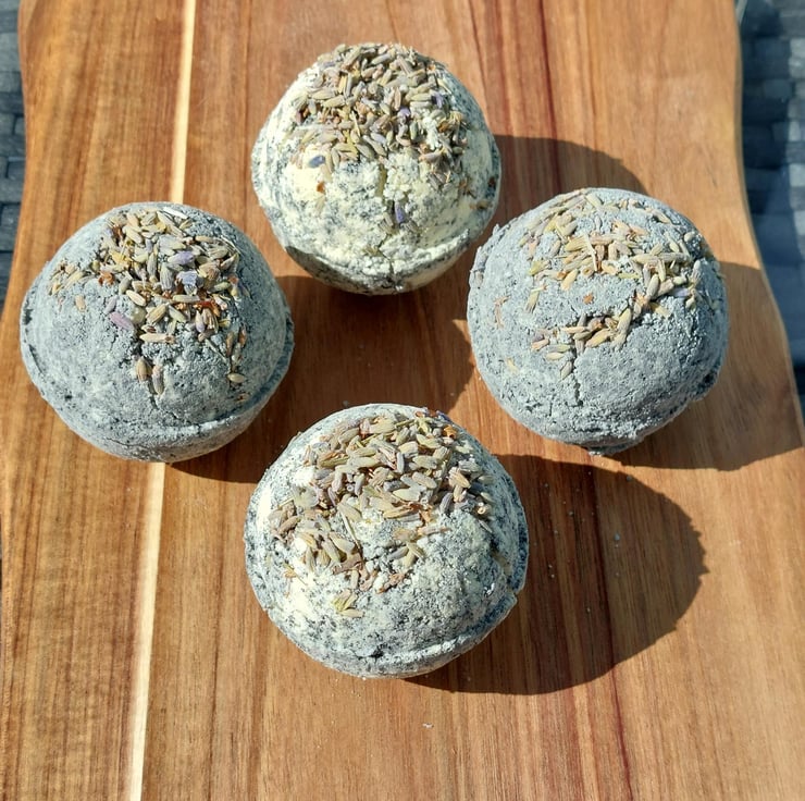 This set includes four bath bombs, and each bomb is approximately 90g. Each bomb is infused with lavender essential oil, activated charcoal and lavender buds for a soothing experience. Calm your mind, body, and soul with the scent of pure lavender, renowned for its ability to relax and decrease feelings of stress and anxiety.