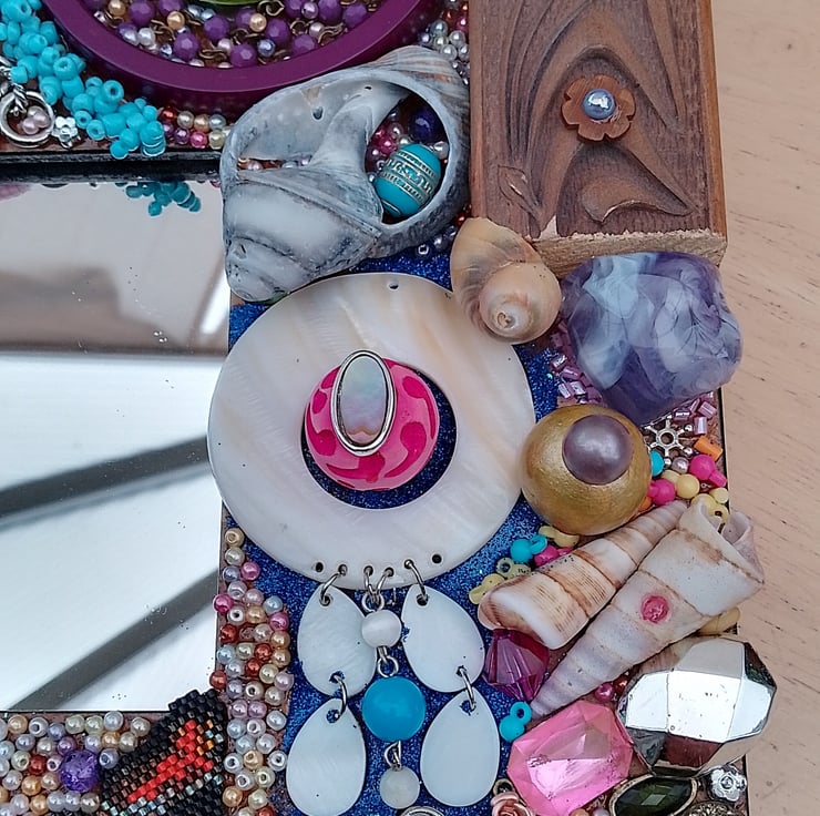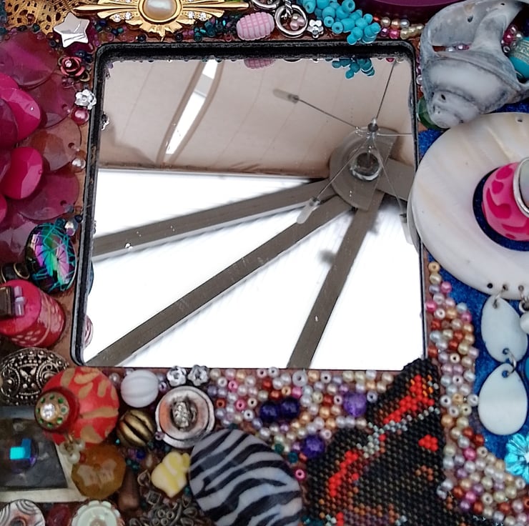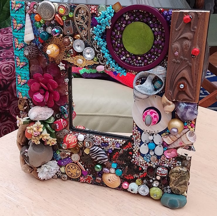 26 cm/10" square frame covered with beads, shells, upcycled broken jewellery, beach finds, wood, plastic and much more surrounding a 10 cm/4" mirror. All measurements are approximate and please ignore the reflection in the mirror.