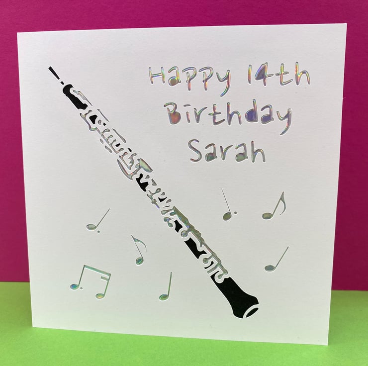 This cleverly designed card has been made by paper cutting a hand drawn oboe and sticking silver and black card behind the image. The silver card has then been hand embossed so it is flush with the card. There is a personalised message on the front, this can be whatever you would like it to be.