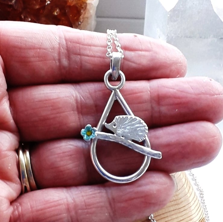 The sterling silver raindrop pendant is handmade from solid sterling silver before cutting out the sterling silver hedgehog from sheet, giving her her features and soldering onto hammered oval wire, the forget me not flower is also cut from sheet as is the bail, before soldering the whole piece together. Once the pendant was fully hallmarked by sheffield assay office i glass enameled the flower in transparent blue with a small amount of yellow for the centre.