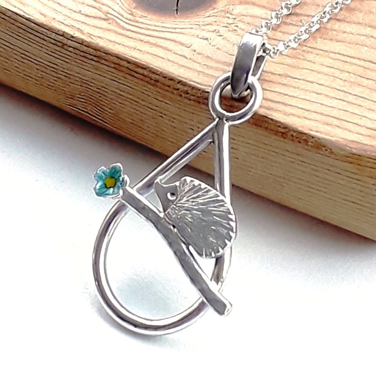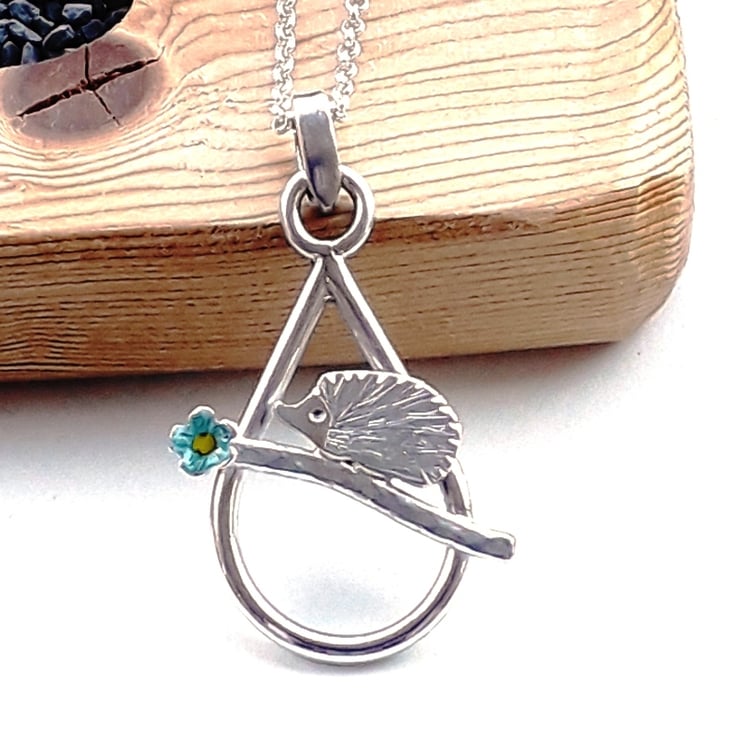 This cute hedgehog necklace is called Petal she loves to wander around the garden smelling the blue forget me not flowers.