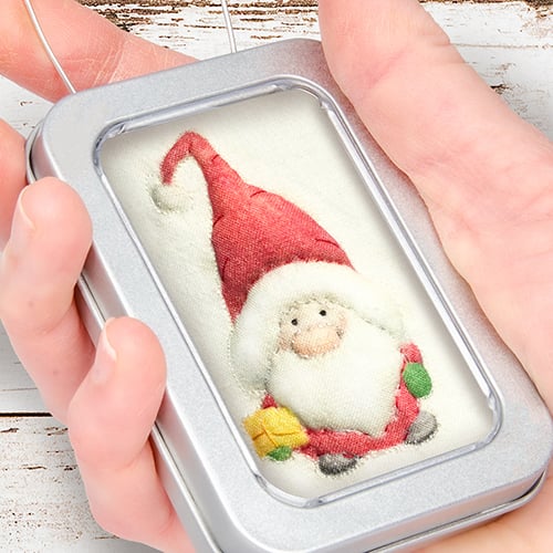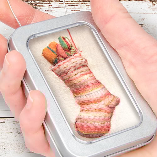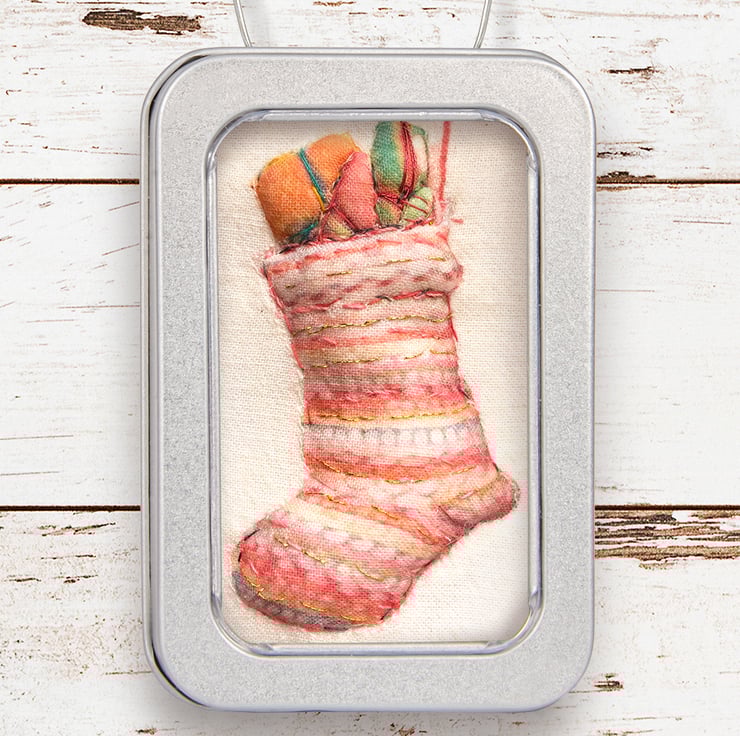 little 3D hand embellished, textile prints - stitched and framed in tins, with a loop to hang them up