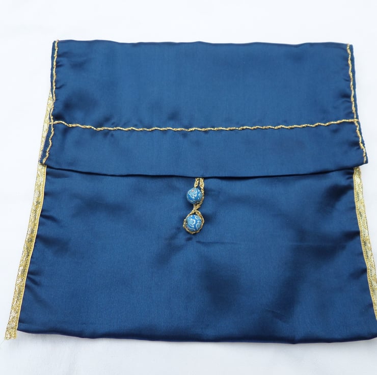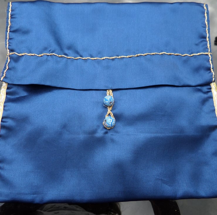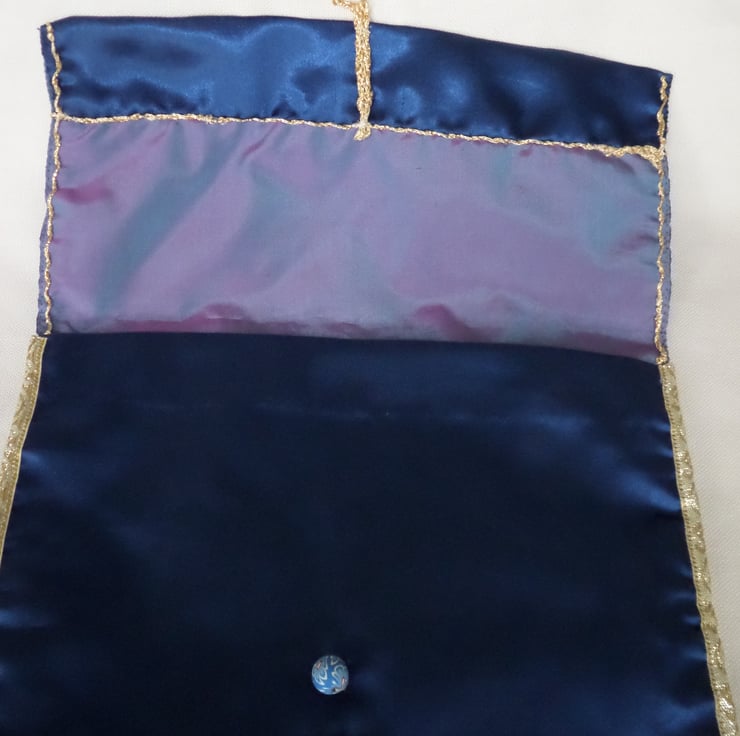 a beautiful dark blue and gold handmade bag for trinkets, tights or handkerchiefs. The bag has a lovely toning lining.