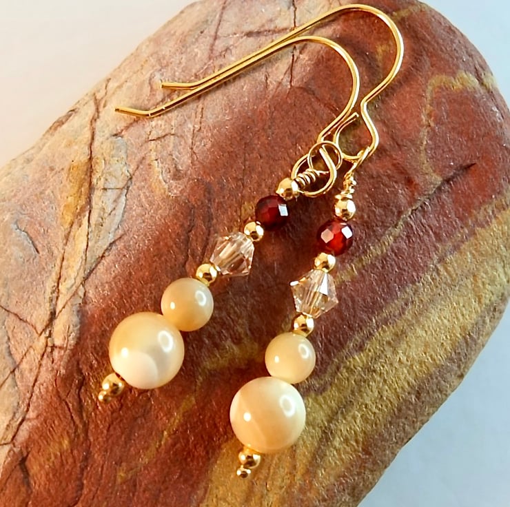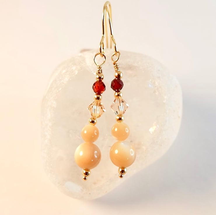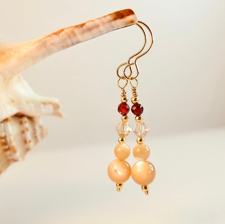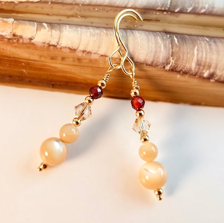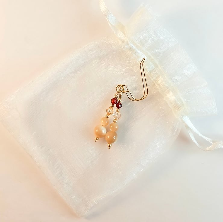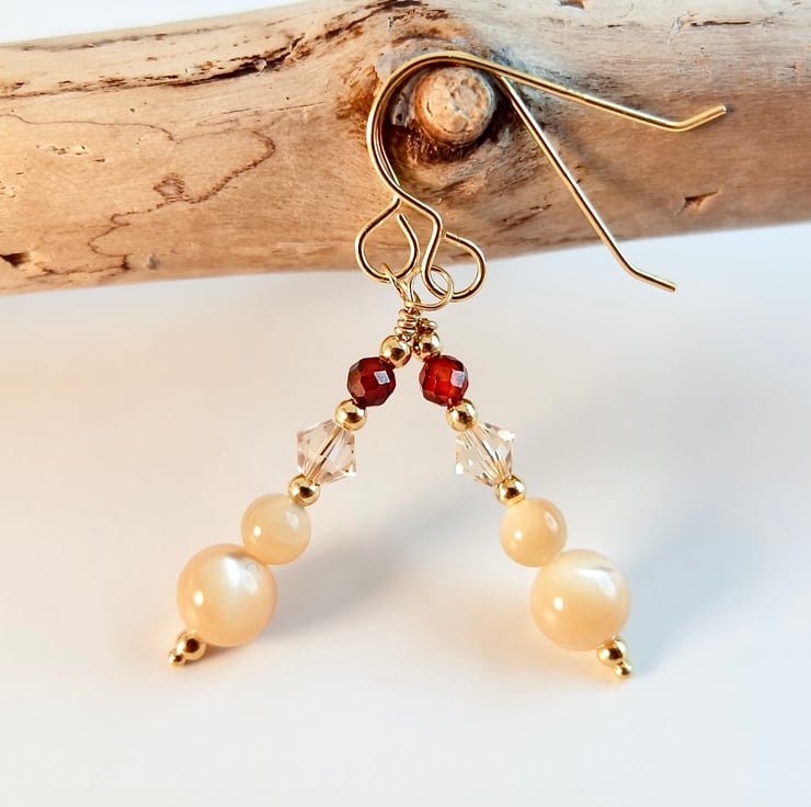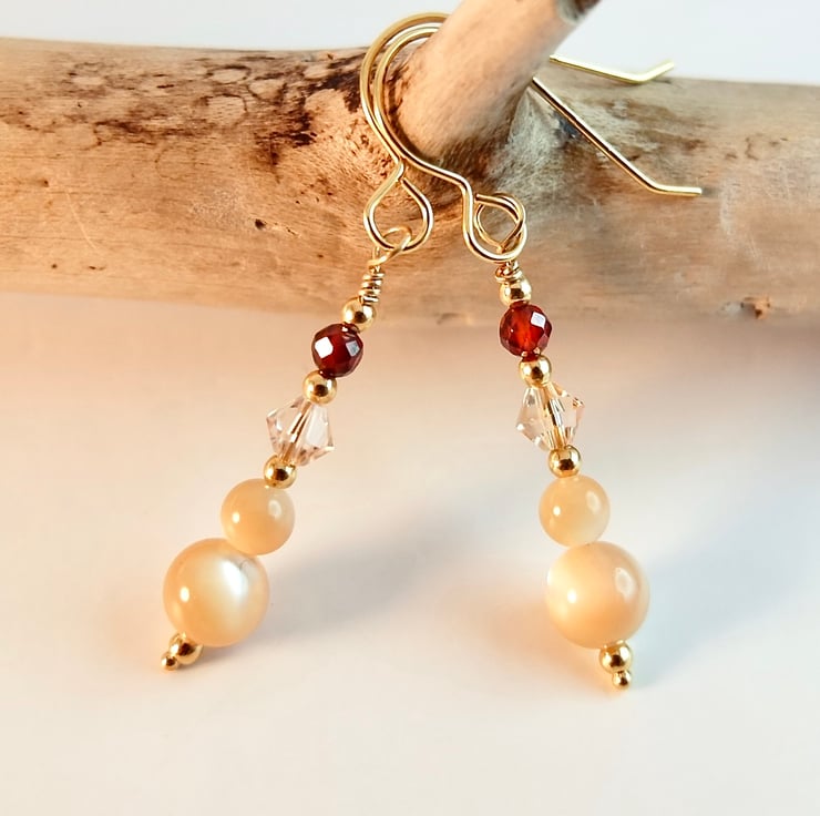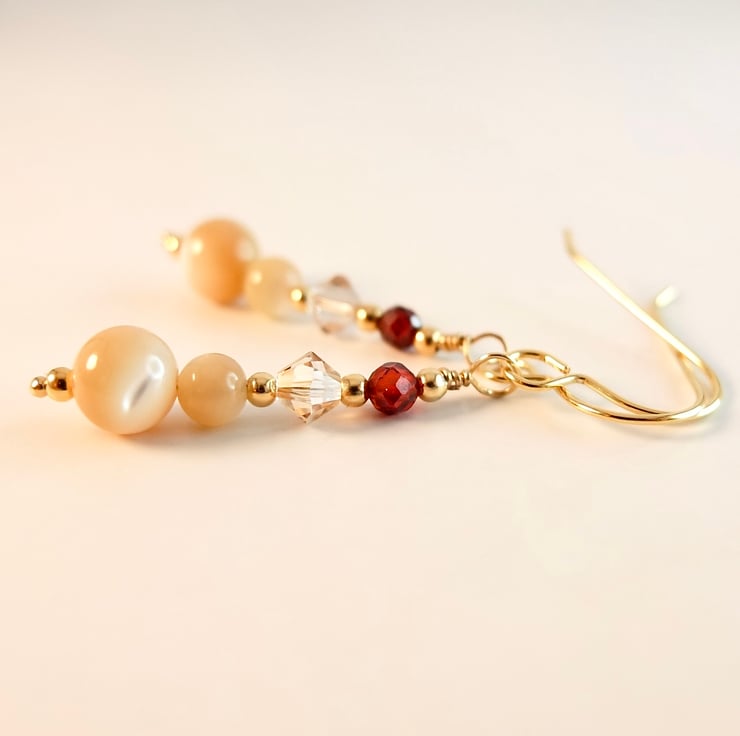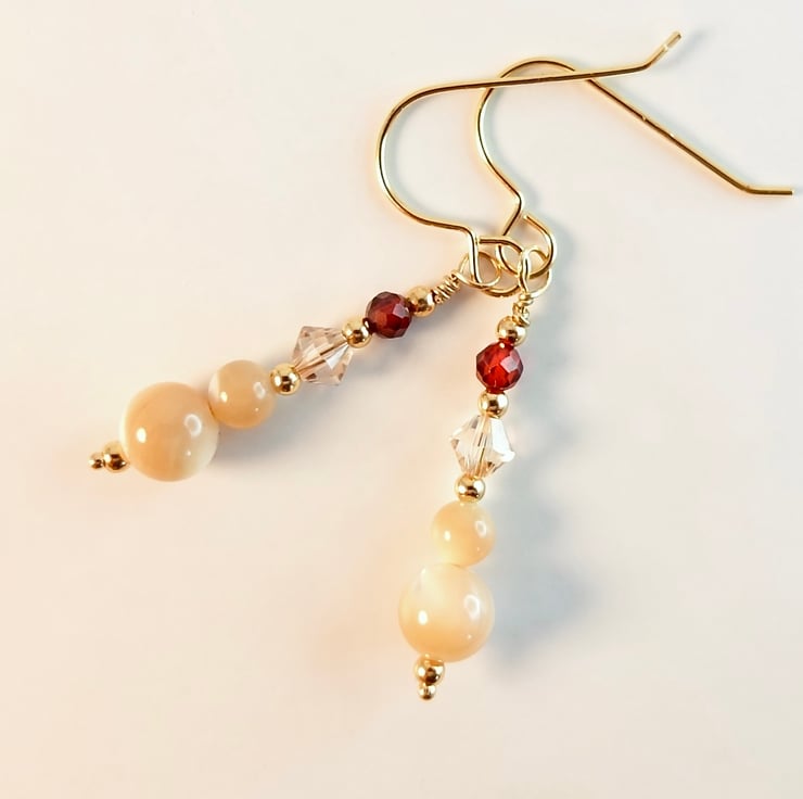 Each of these dainty earrings features a 6mm and a 4mm cream Mother-of-Pearl bead topped with a 4mm 'silk' Swarovski bicone and a 3mm micro-faceted burnt orange Zircon bead, separated by tiny 2mm gold vermeil rounds.