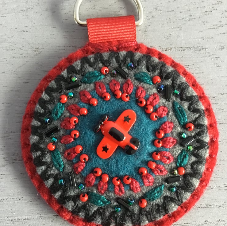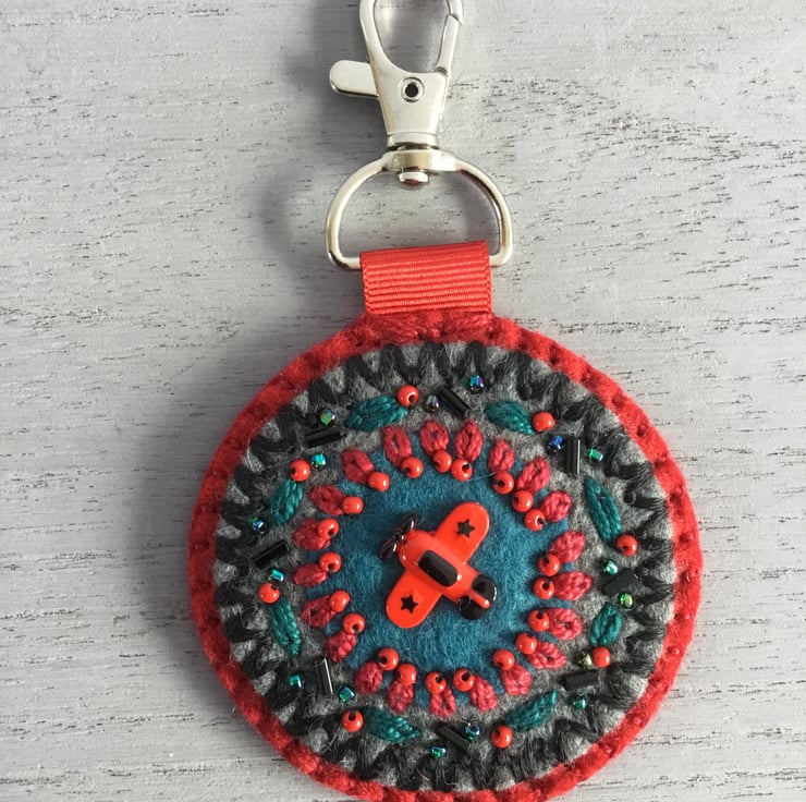 This Hand Embroidered Vintage Aeroplane Keyring or Bag Charm in red, grey, jade and black colours, has a red Aeroplane button, with a vintage feel, stitched onto circles of jade, grey and red felt. This Aeroplane button is surrounded by hand embroidered Lazy-Daisy and Fly Stitches, dotted with red, jade and black beads.