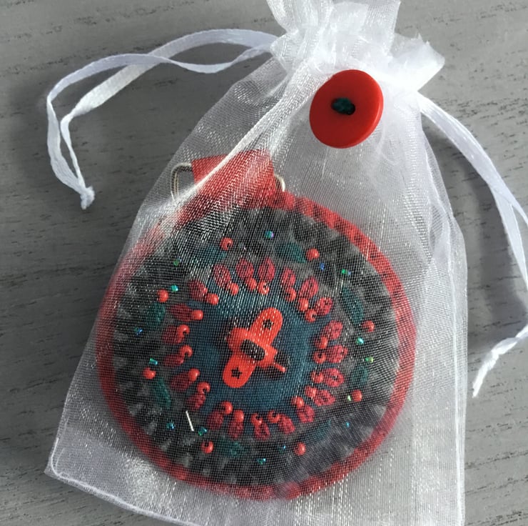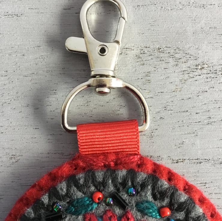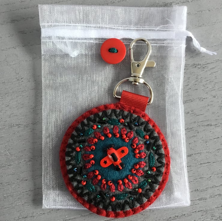 This circular keyring is edged with hand embroidered red Blanket Stitches. It’s 2.50 inches (6 cms) in diameter. A red ribbon with a metal lobster catch key fob is at the top…….ready to attach a key……..or to accessorise a bag or rucksack….