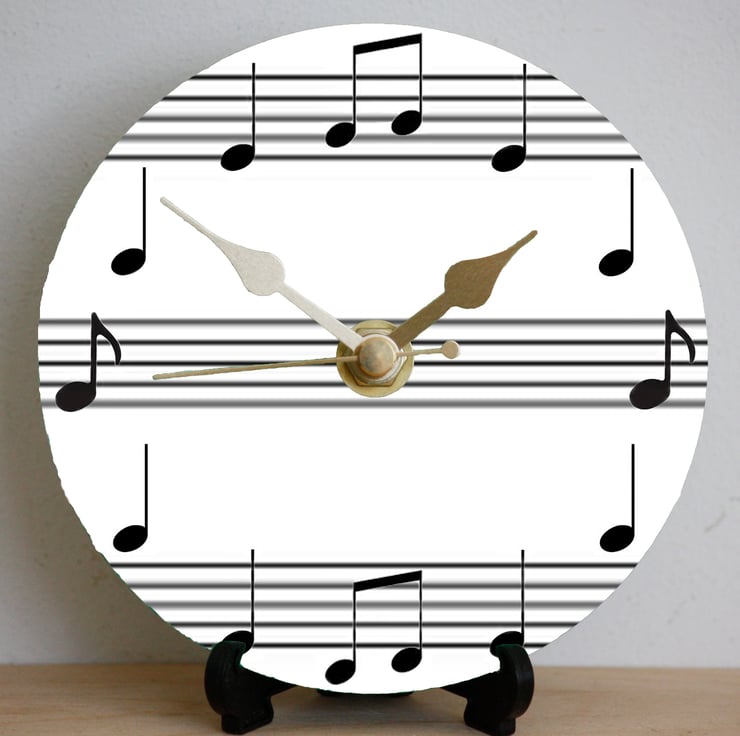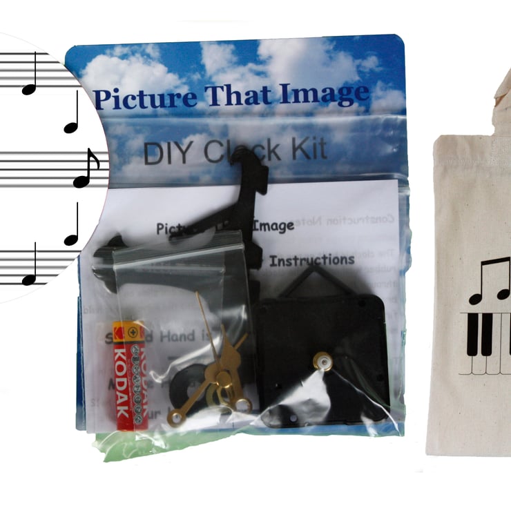 The illustration of musical notes is printed on to a 12cm Aluminium clock face. Everything that you need to build this unique clock is included in the pack, including a stand and a battery. It comes with a full set of instructions with an easy to follow diagram. It can be used with the stand or it will hang on the wall on a picture hook. It will make an ideal present and is easy to construct. (It does contain small parts so is not for very young children)