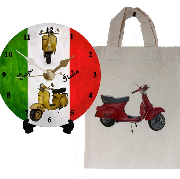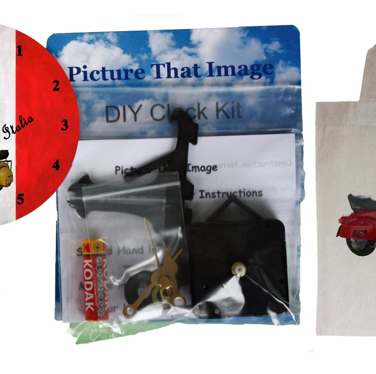 The clock face is from original photographs of a Vespa Scooter by Picture That Image and is printed on to a 12cm Aluminium clock face. Everything that you need to build this unique clock is included in the pack, including a stand and a battery. It comes with a full set of instructions with an easy to follow diagram. It can be used with the stand or it will hang on the wall on a picture hook. It will make an ideal present and is easy to construct. (It does contain small parts so is not for very young children)