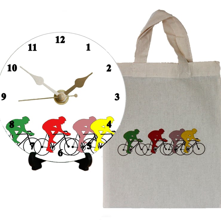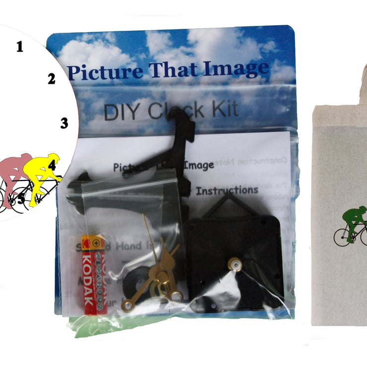 The illustration of cyclists is printed on to a 12cm Aluminium clock face. Everything that you need to build this unique clock is included in the pack, including a stand and a battery. It comes with a full set of instructions with an easy to follow diagram. It can be used with the stand or it will hang on the wall on a picture hook. It will make an ideal present and is easy to construct. (It does contain small parts so is not for very young children)