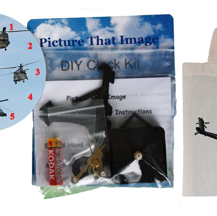 The clock face is from original photographs of helicopters by Picture That Image and is printed on to a 12cm Aluminium clock face. Everything that you need to build this unique clock is included in the pack, including a stand and a battery. It comes with a full set of instructions with an easy to follow diagram. It can be used with the stand or it will hang on the wall on a picture hook. It will make an ideal present and is easy to construct. (It does contain small parts so is not for very young children)