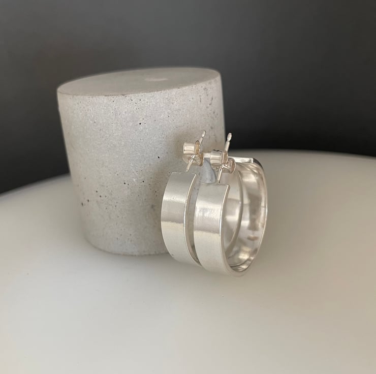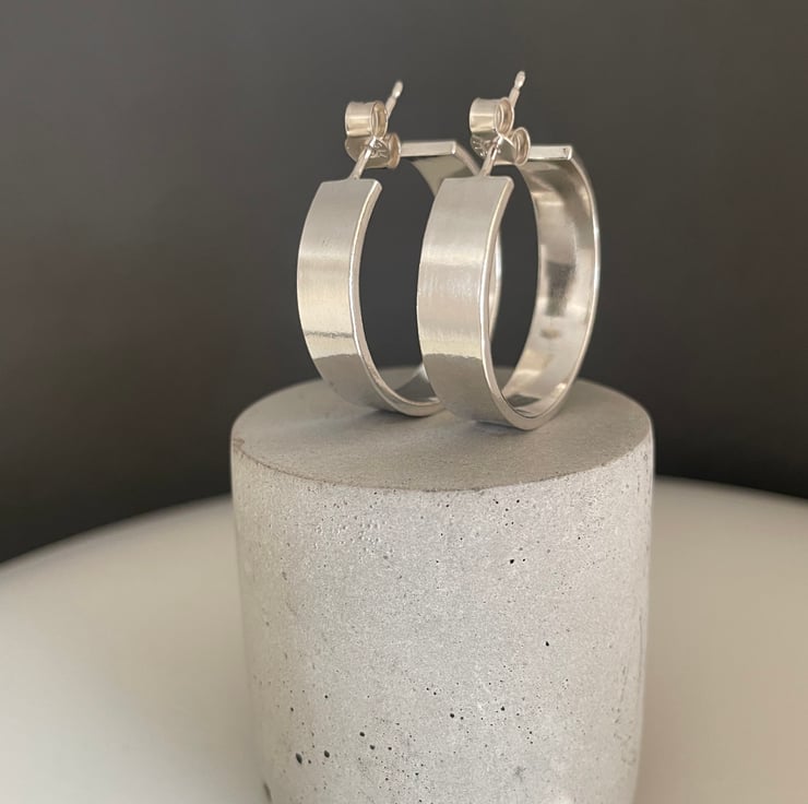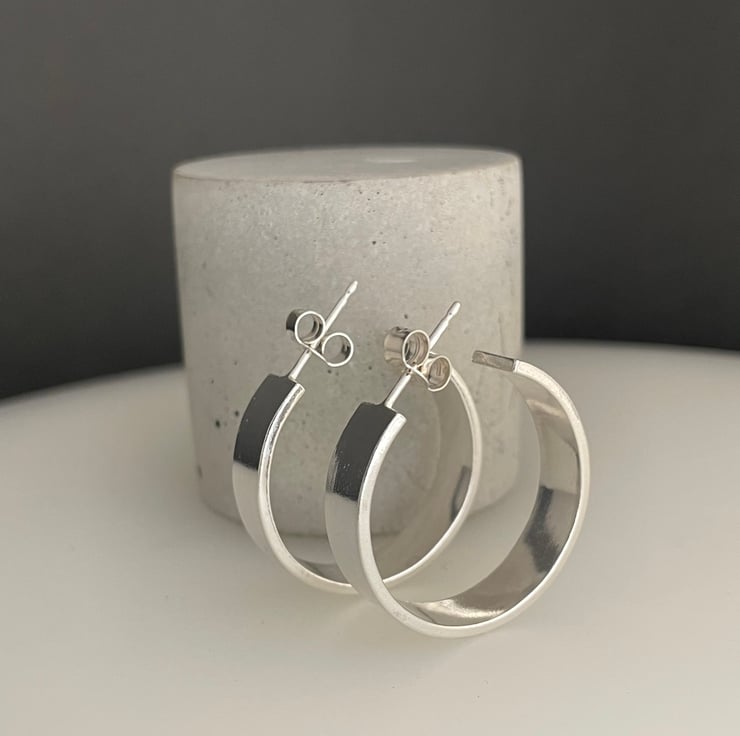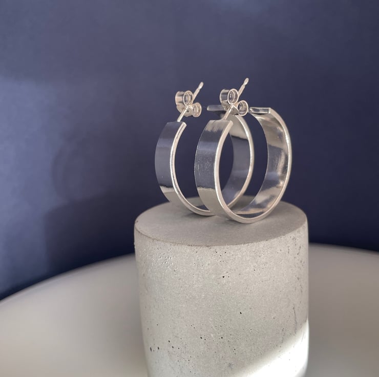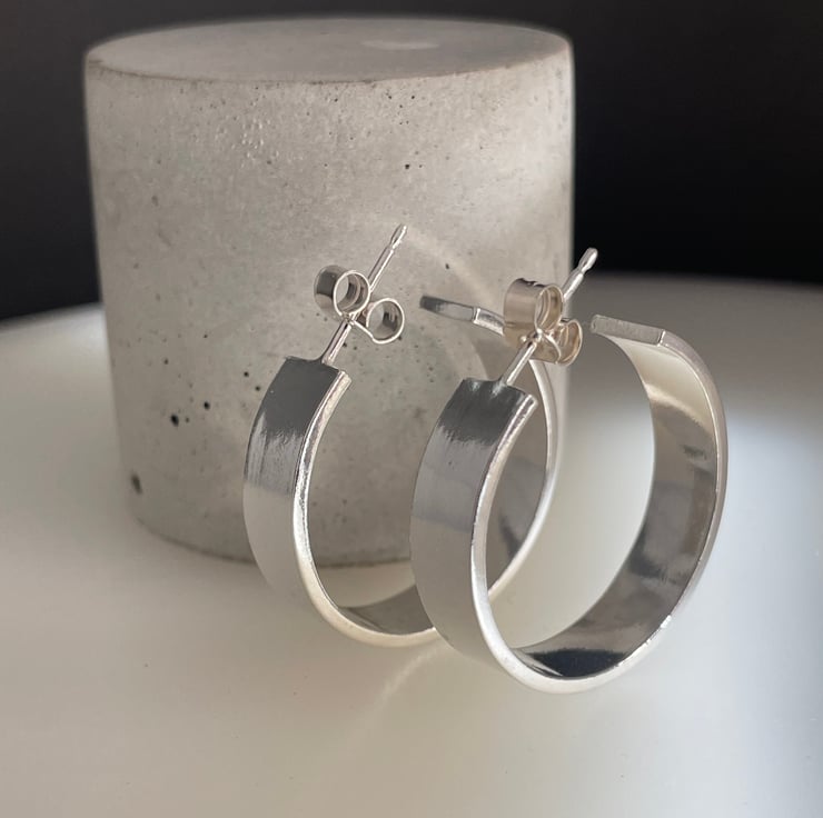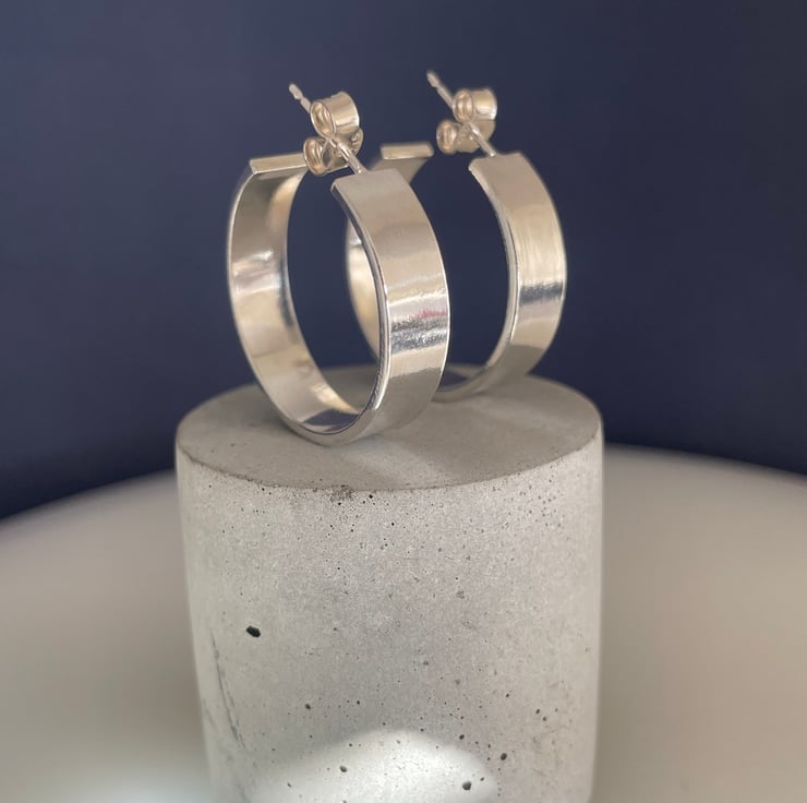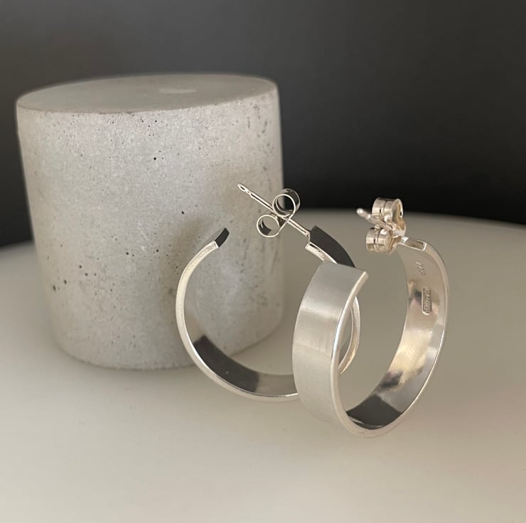 A lovely pair of chunky wide hoop earrings handmade from 925 sterling silver. Cut by hand from solid 1.2mm thick/6mm wide silver rectangular wire, formed into circular shapes then worked to a plain smooth surface. They have long silver pin fittings and secured with stamped (925) silver scroll’s/butterfly’s