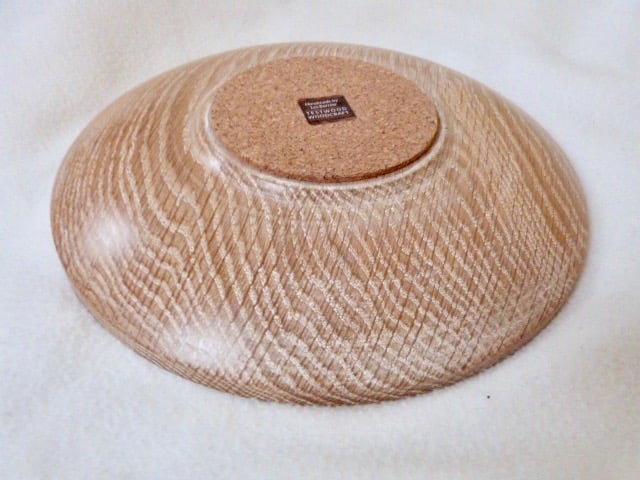 An oak shallow bowl or platter with satin acrylic finish, 25cm wide and 3 cm deep. its not dishwasher safe and should be cleaned with simple wipe clean.. I have embellished the underside with a lime wax that highlights the grain. The foot has a cork cover