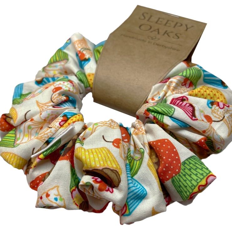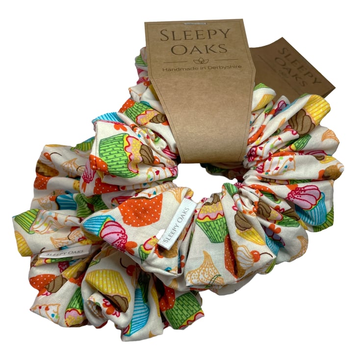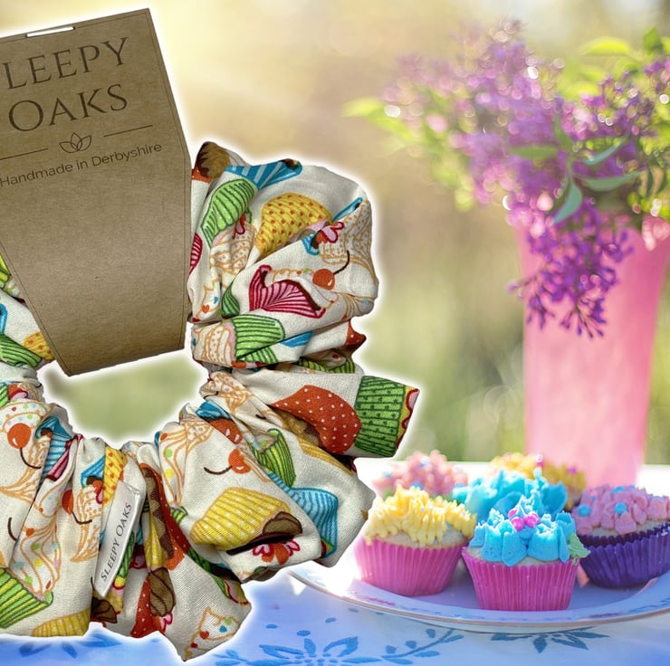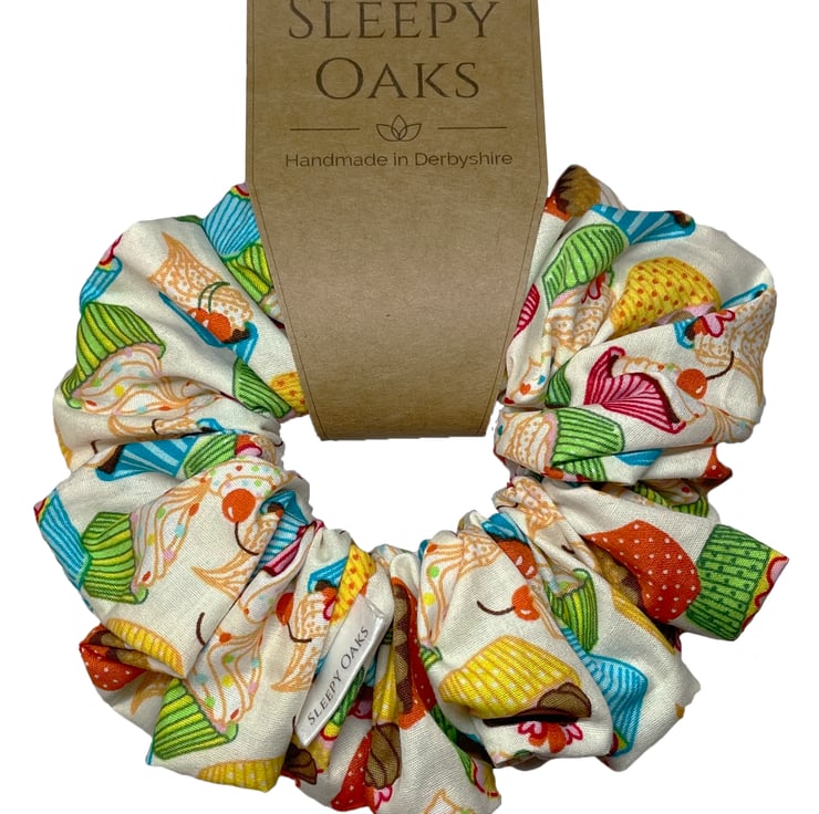 'Say it with Cake!' is a pretty scrunchie covered in little cupcakes.
