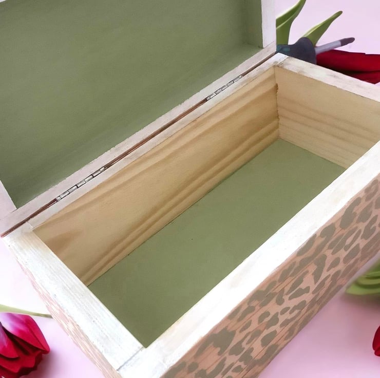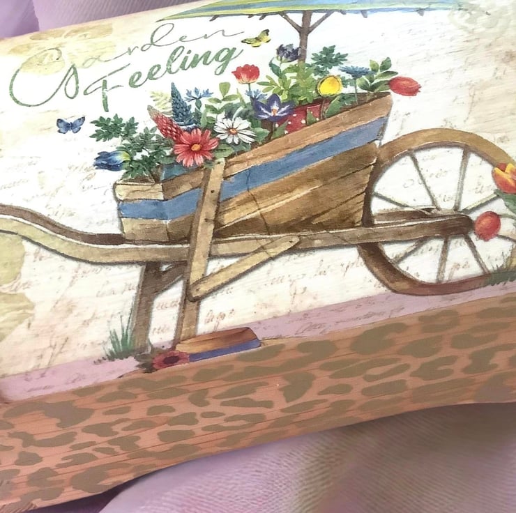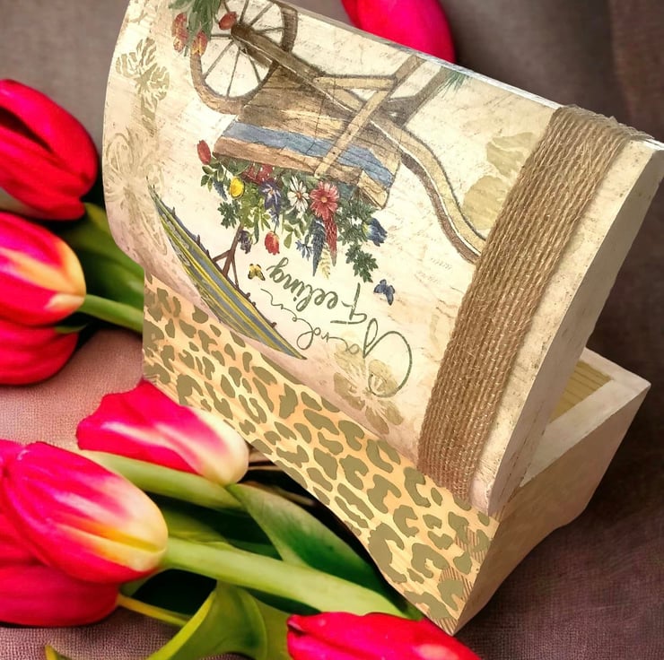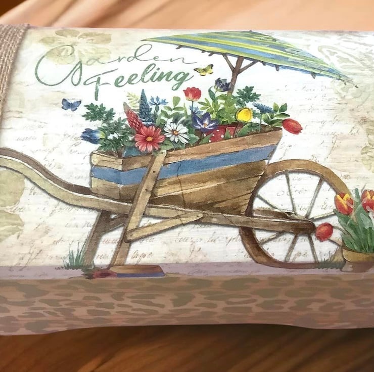 This beautifully handmade box has been painted, decoupaged, stencilled and waxed to create a stunning seed box for any garden lover. The design shows vibrant flowers in a wheelbarrow and parasol. It has been painted in chalk white and sage green prior to applying the image, stencilling and waxing. The wax really highlights the subtle stencilling. The box is finished in clear varnish.