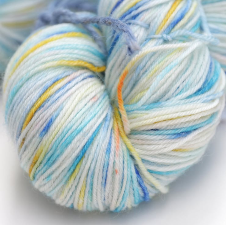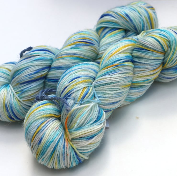 Off-white with splashes of blue, cyan, yellow and a little orange. This is a standard 4-ply 'sock' yarn with a nylon content to add robustness. There is one skein left. Photos have been taken and edited in bright natural light.