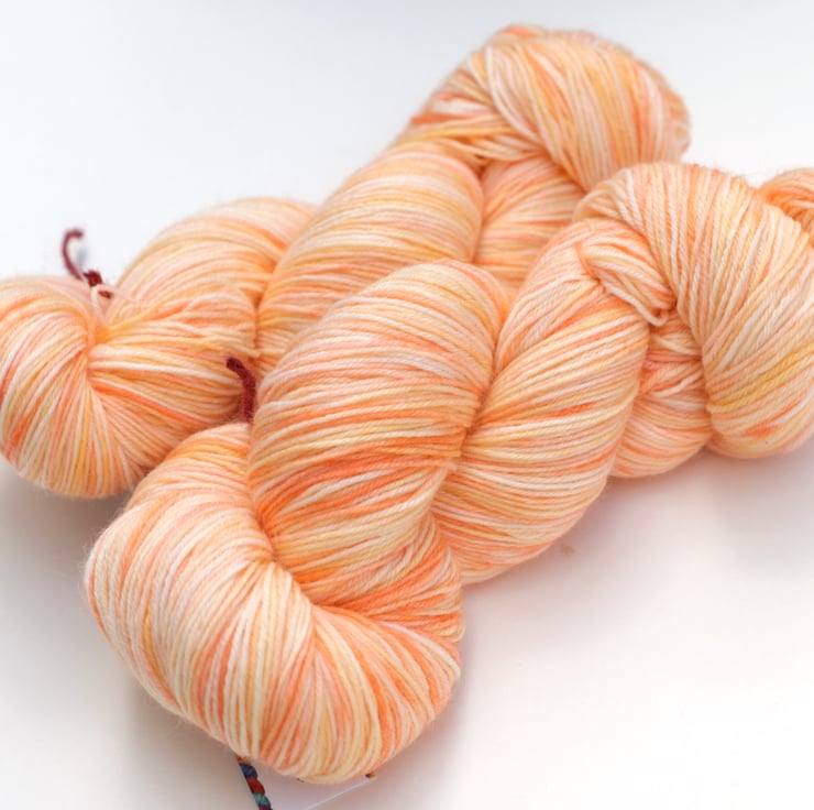 Mottled peaches, light orange and off-white. This is a standard 4-ply 'sock' yarn with a nylon content to add robustness. There is one skein left. Photos have been taken and edited in bright natural light.