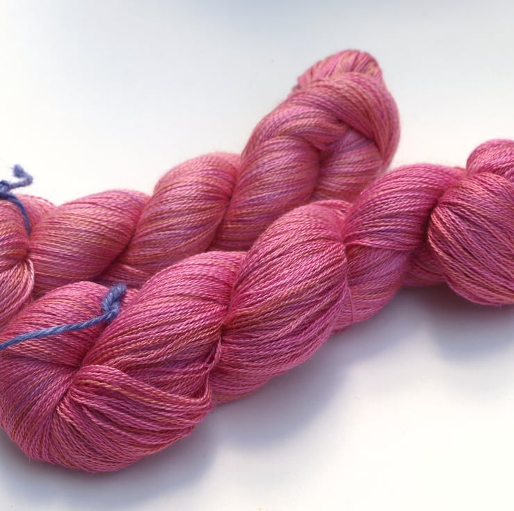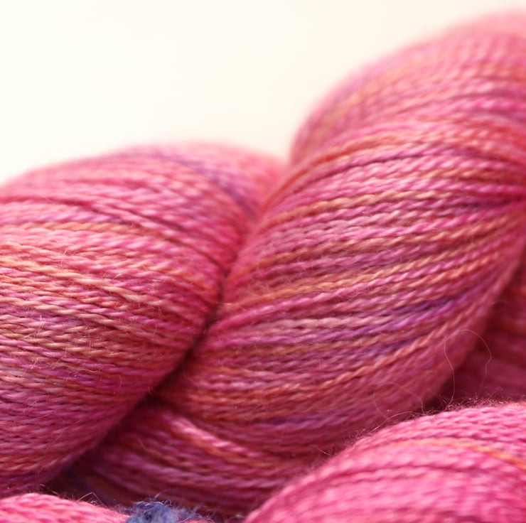 Soft rose petal pink with peach and lilac hints. This gorgeous and luxurious yarn has the softness and warmth of alpaca with the smooth sheen and cool feel of silk. It should make beautiful lace projects. There is one skein left - it is the slightly lighter pink skein as shown in the first photo and to the rear of the second photo. Photographs have been taken and edited in bright natural light (first photo is more accurate for colour).