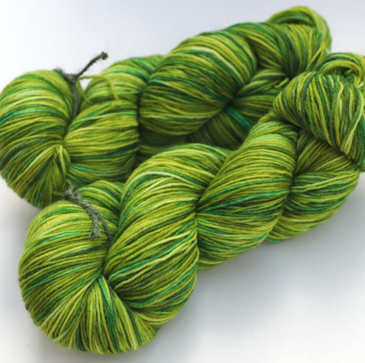 Lime green and chartreuse with emerald and olive. This is a standard 4-ply 'sock' yarn with a nylon content to add robustness. There are two skeins available, price shown is for one. Photos have been taken and edited in bright natural light.