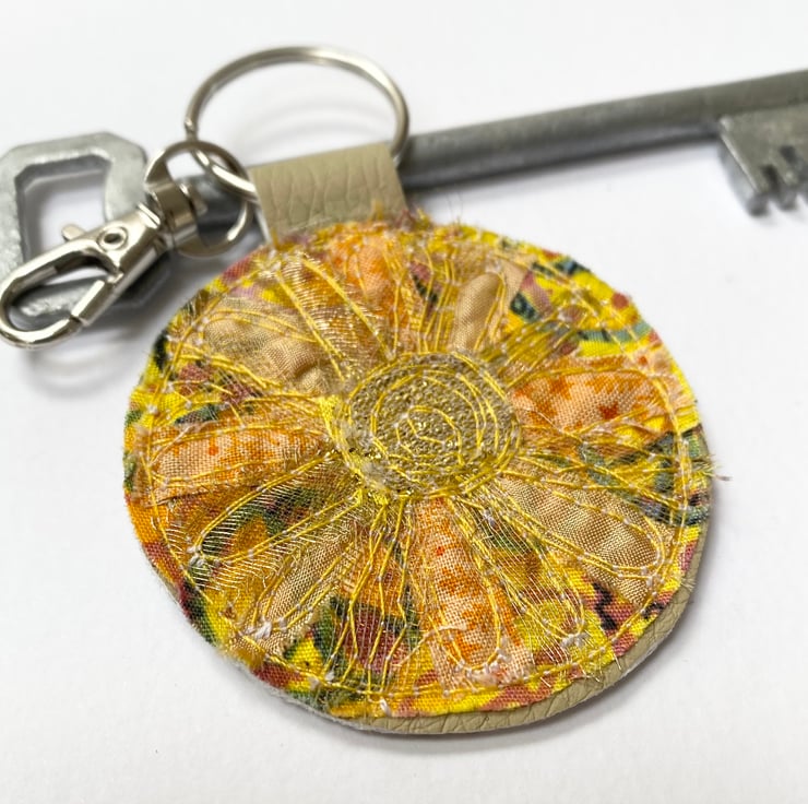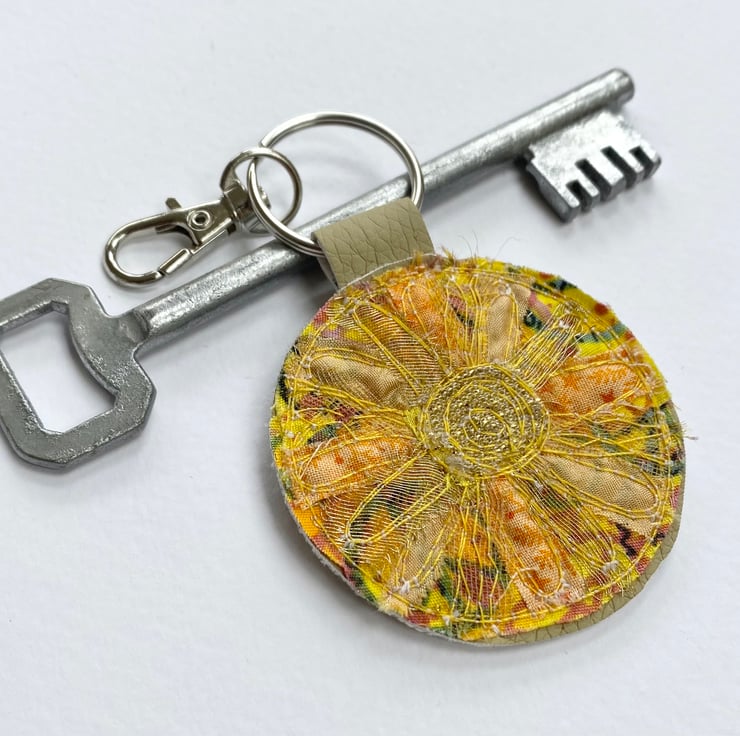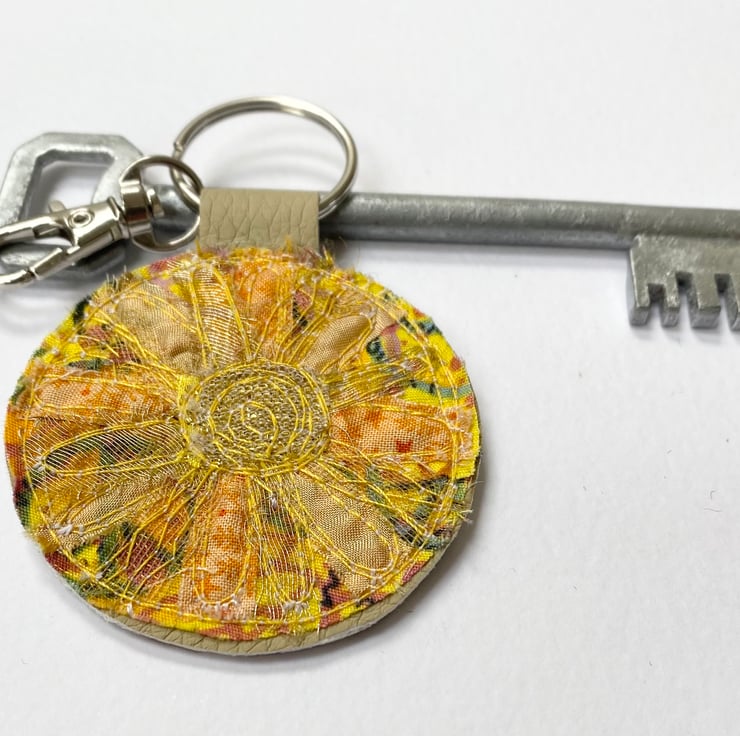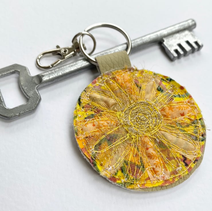 My circular up-cycled keyring has a beautiful glowing sun on it. It’s plain in the back. It measures 5.5cm diameter. With the split ring and lobster clasp the length is 11cm.