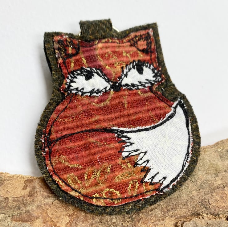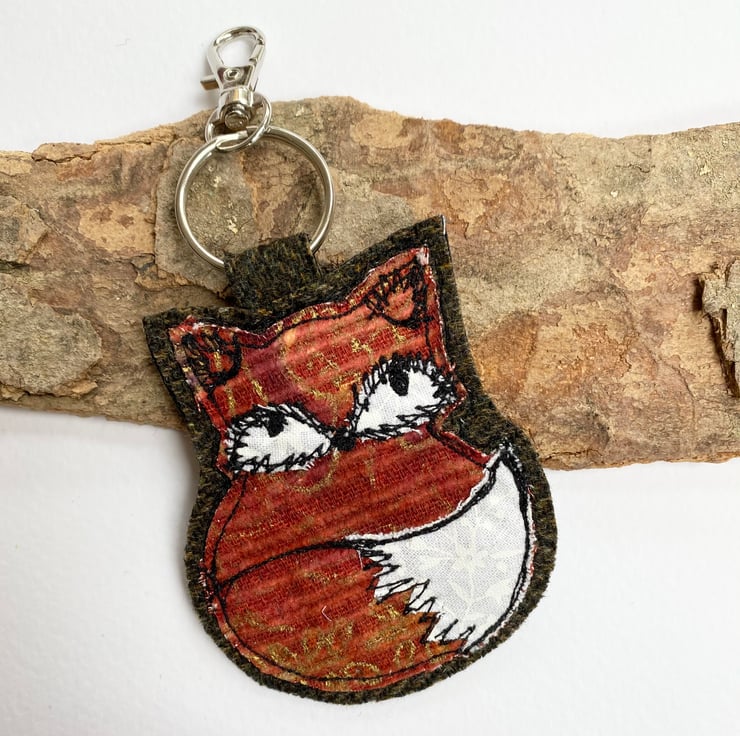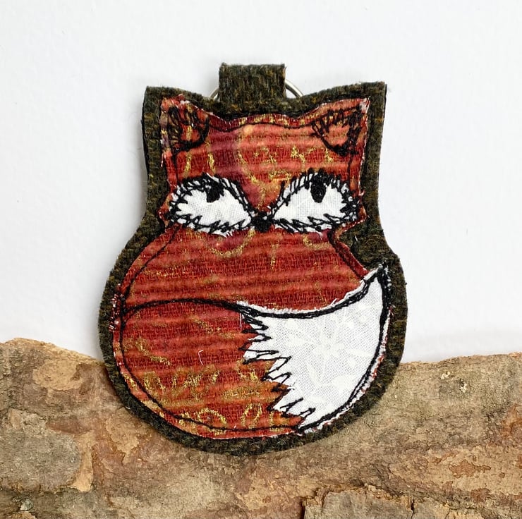 My up-cycled plaid keyring has a gorgeous fox on it. It’s plain in the back. It measures 6 x 8.5cm. With the split ring and lobster clasp the length is 12.5cm.