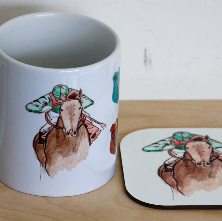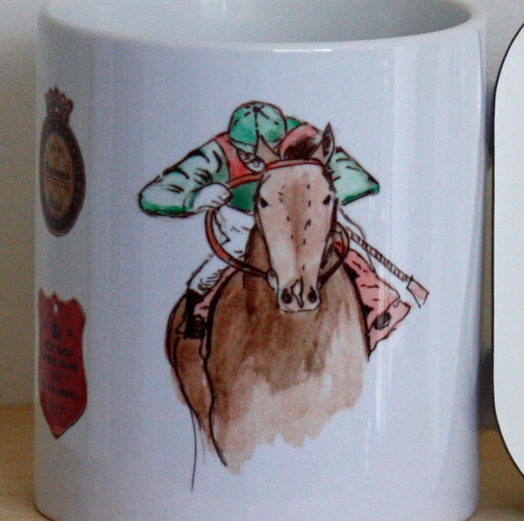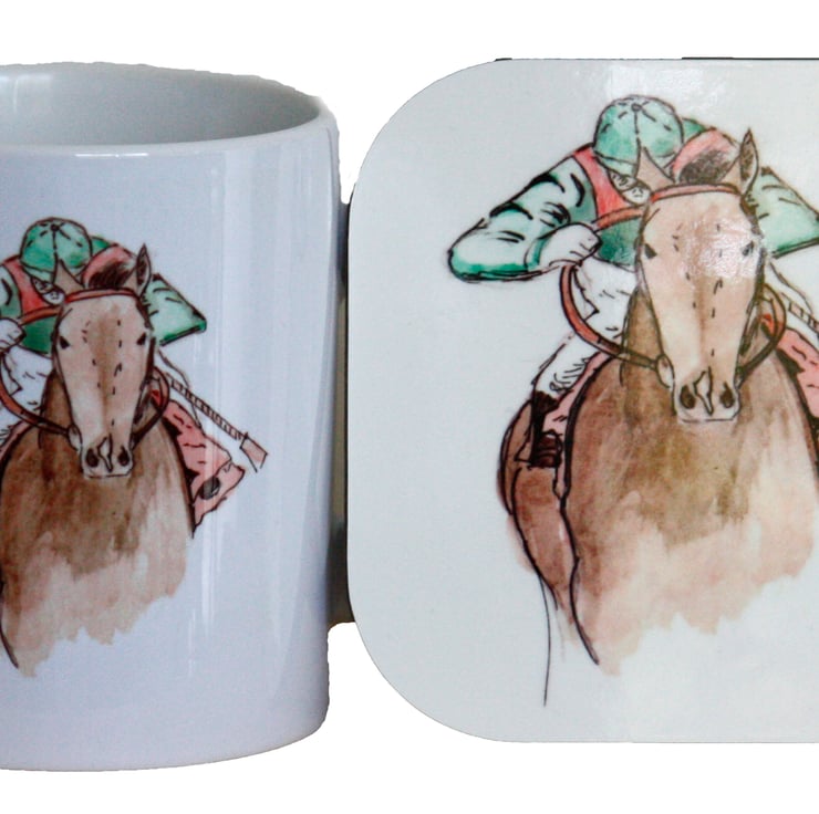 This gift set consists of an 8cm diameter by 9.2cm high, dishwasher and microwave proof Mug with illustrations of a Race Horse and Badges from Race Meetings around the sides PLUS a coaster with a similar illustration.