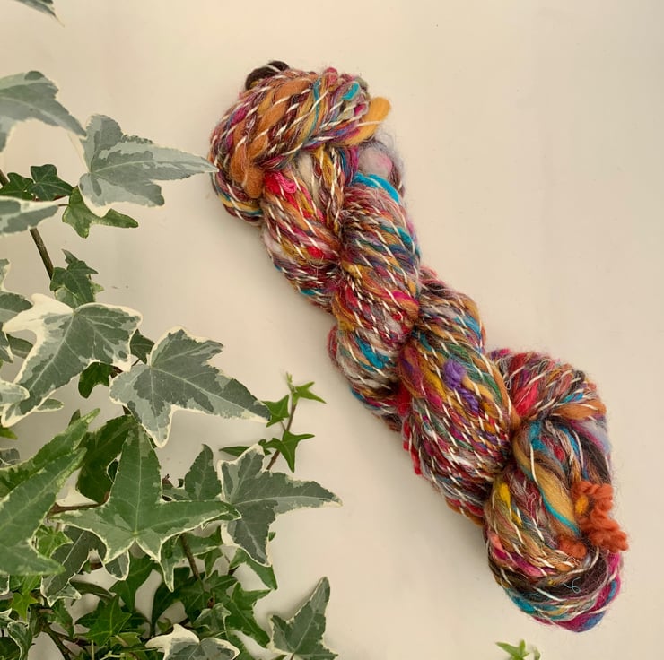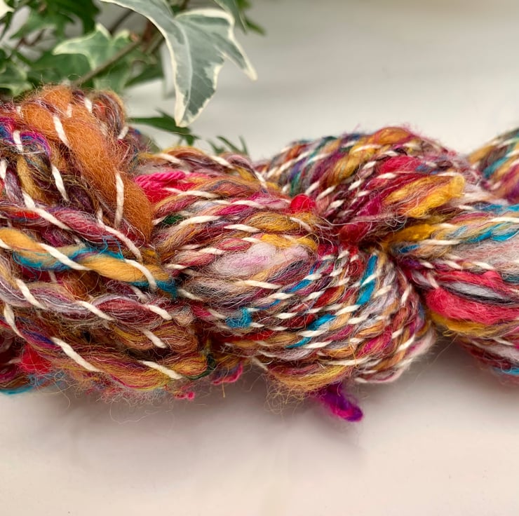 Hand blended and spun, OOAK Corriedale, merino, cotton, and wool locks blend.