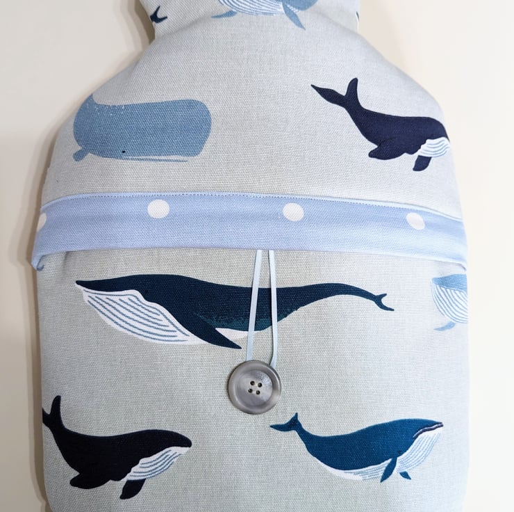 This is a handmade hot water bottle cover (comes with a 2 litre hot water bottle ) made in Sophie Allport Whales fabric .