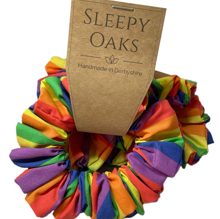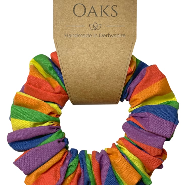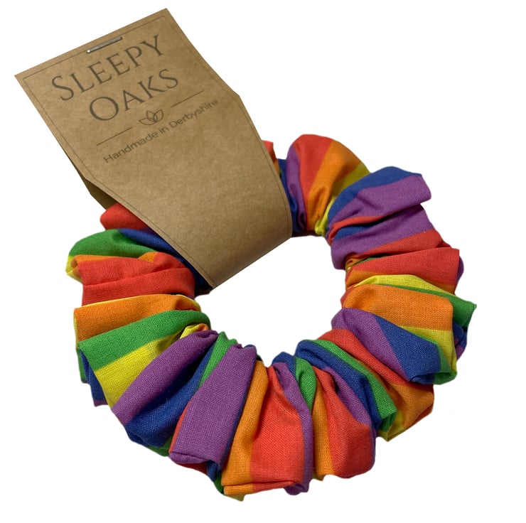 This colourful scrunchie has been made using a rainbow striped poly cotton.