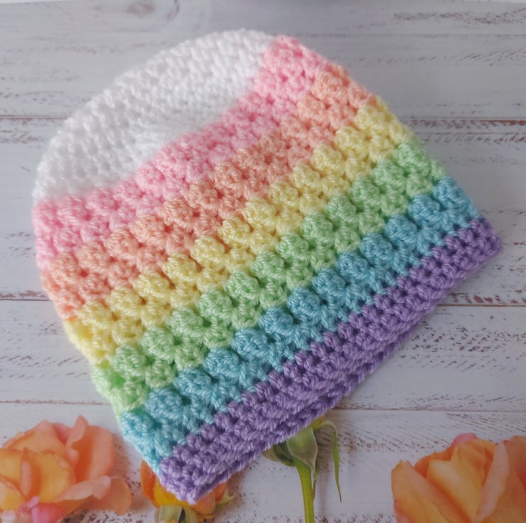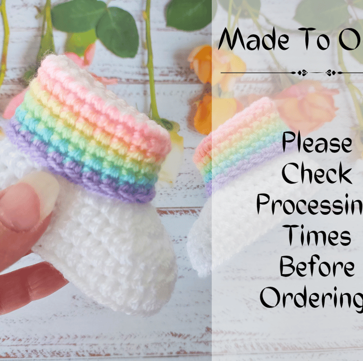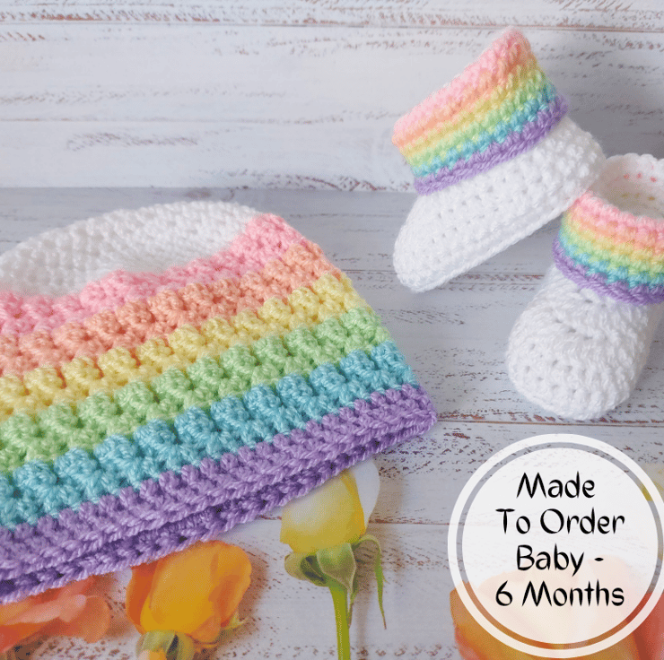 It's a great newborn gift idea to keep a little one warm and cosy. Sizes start from Newborn up to 6 months in this crochet baby set, which includes a pair of rainbow booties and a matching hat.