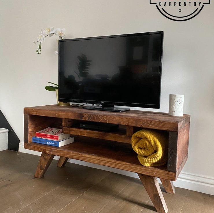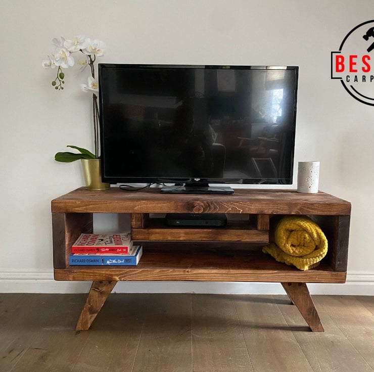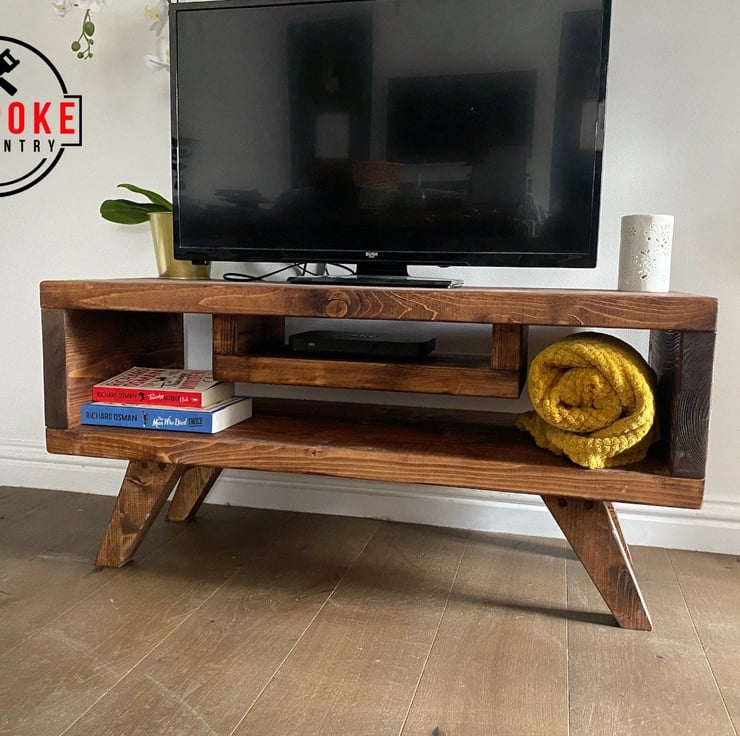 Handmade By The Bespoke Carpentry Co. Solid Pine sleepers have been cut down and restored to chunky 2 timber which we have then planed, sanded & stained to enhance the stunning grain. Hand made angled wooden legs to support the piece. Very strong and capable of holding 100kg.