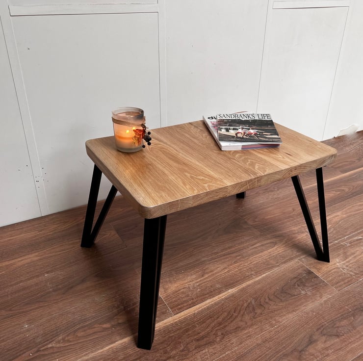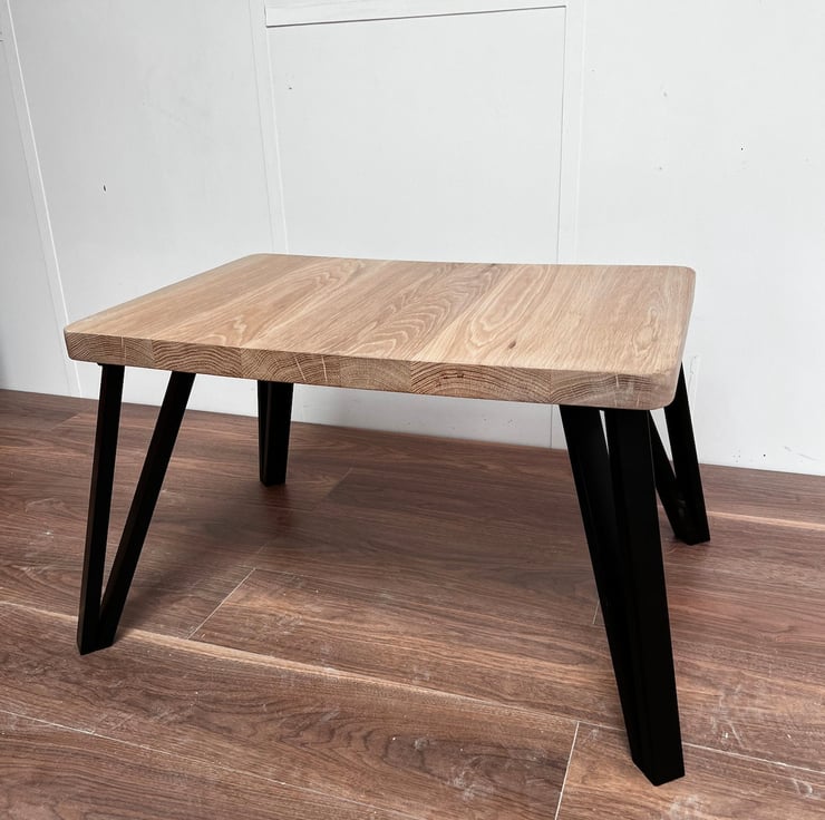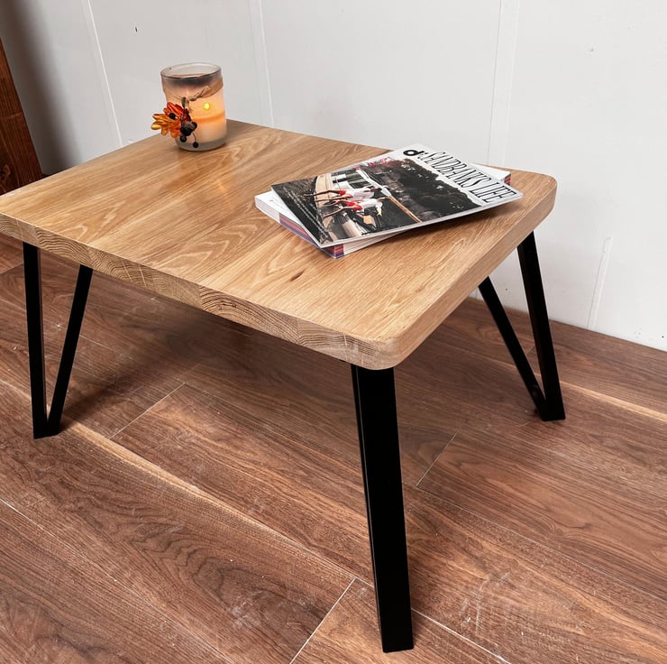 Legs are available in Powder Coated Black Box Hairpins and Solid Oak to Match the Top.