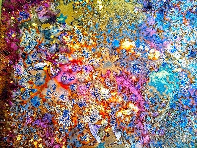 I used Rose Cyclamen ink, which is just the loveliest pink; and Winsor & Newton Gold Ink gives a touch of bling! I also used some Raspberry red dye and some coarse sea salt in the wet cyanotype developing process; the salt gives a wonderful crystalising effect.