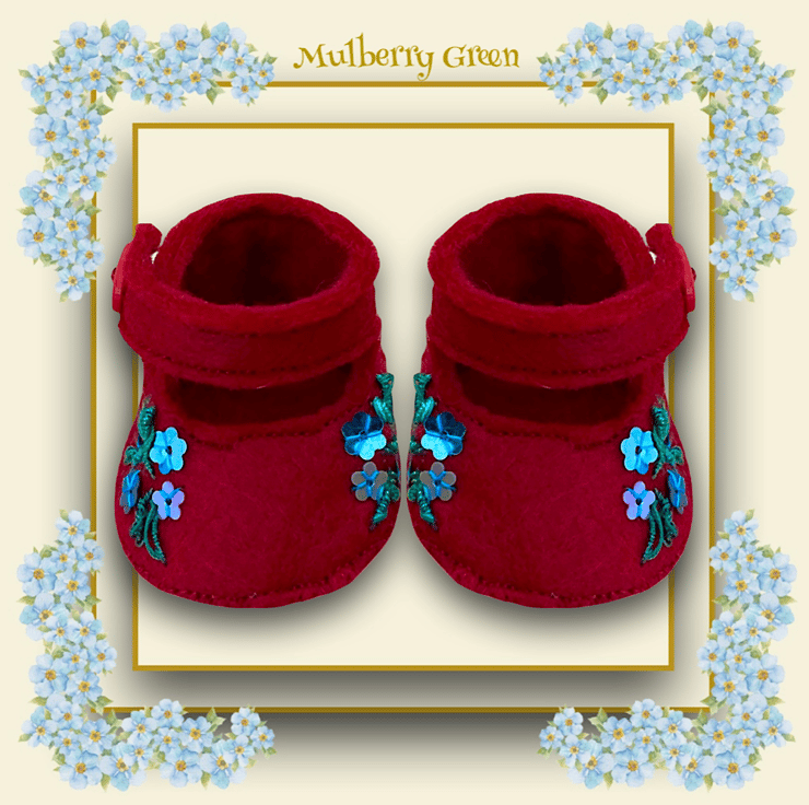 A pretty little pair of red embroidered and sequinned shoes, to fit the Mulberry Green characters. They fasten with a little popper underneath a button.