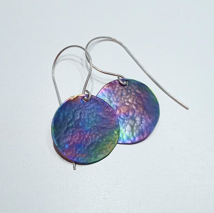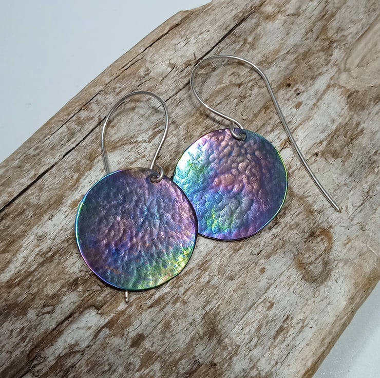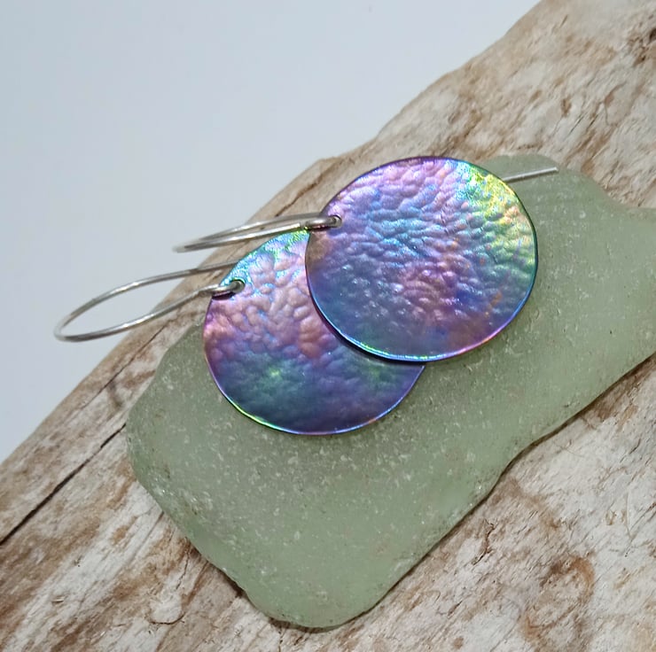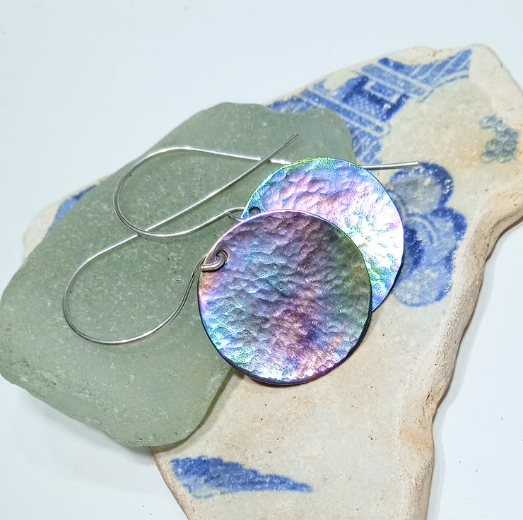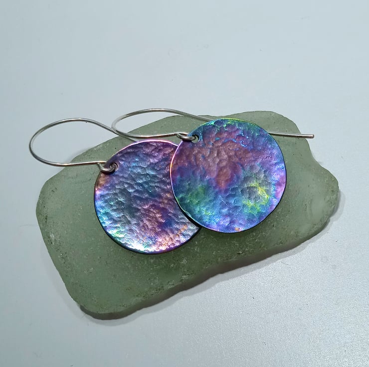 The titanium discs measure approximately 2.2 cm across and are hung from sterling silver earring wires which I have also handmade.
